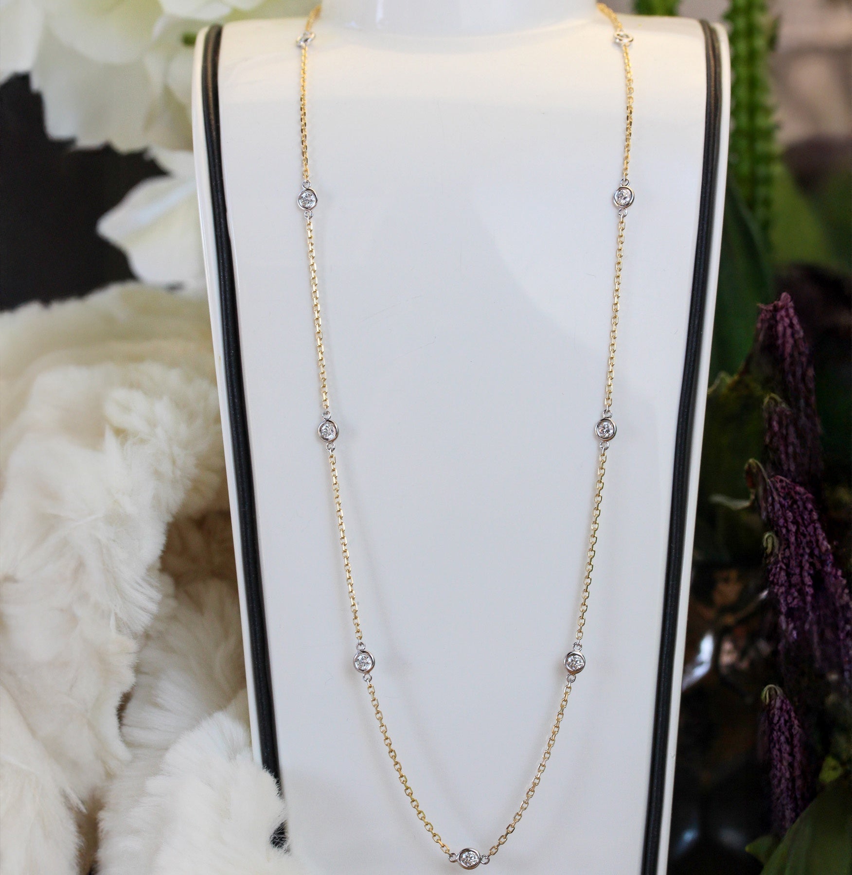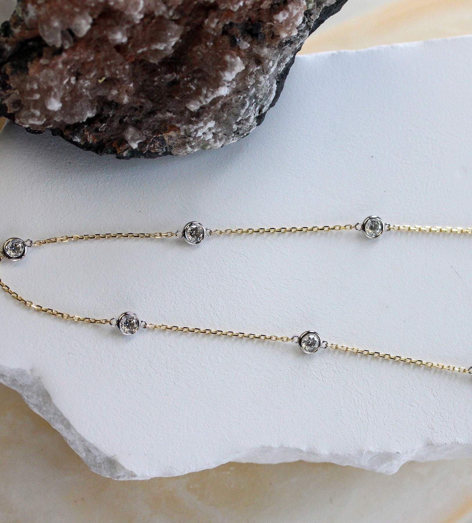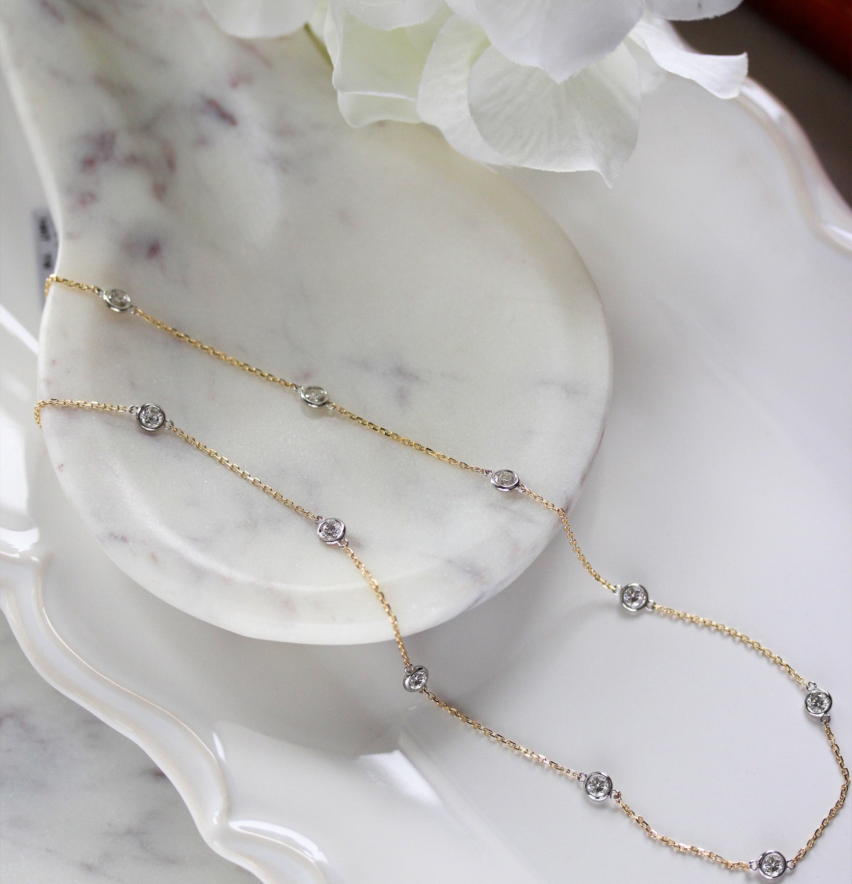 Timeless and refined, this 14K two-tone necklace features bezel-set diamonds totaling 0.72 carats, spaced delicately along a fine chain. The combination of yellow and white gold offers effortless versatility, making it a staple piece for everyday luxury or layered styling.