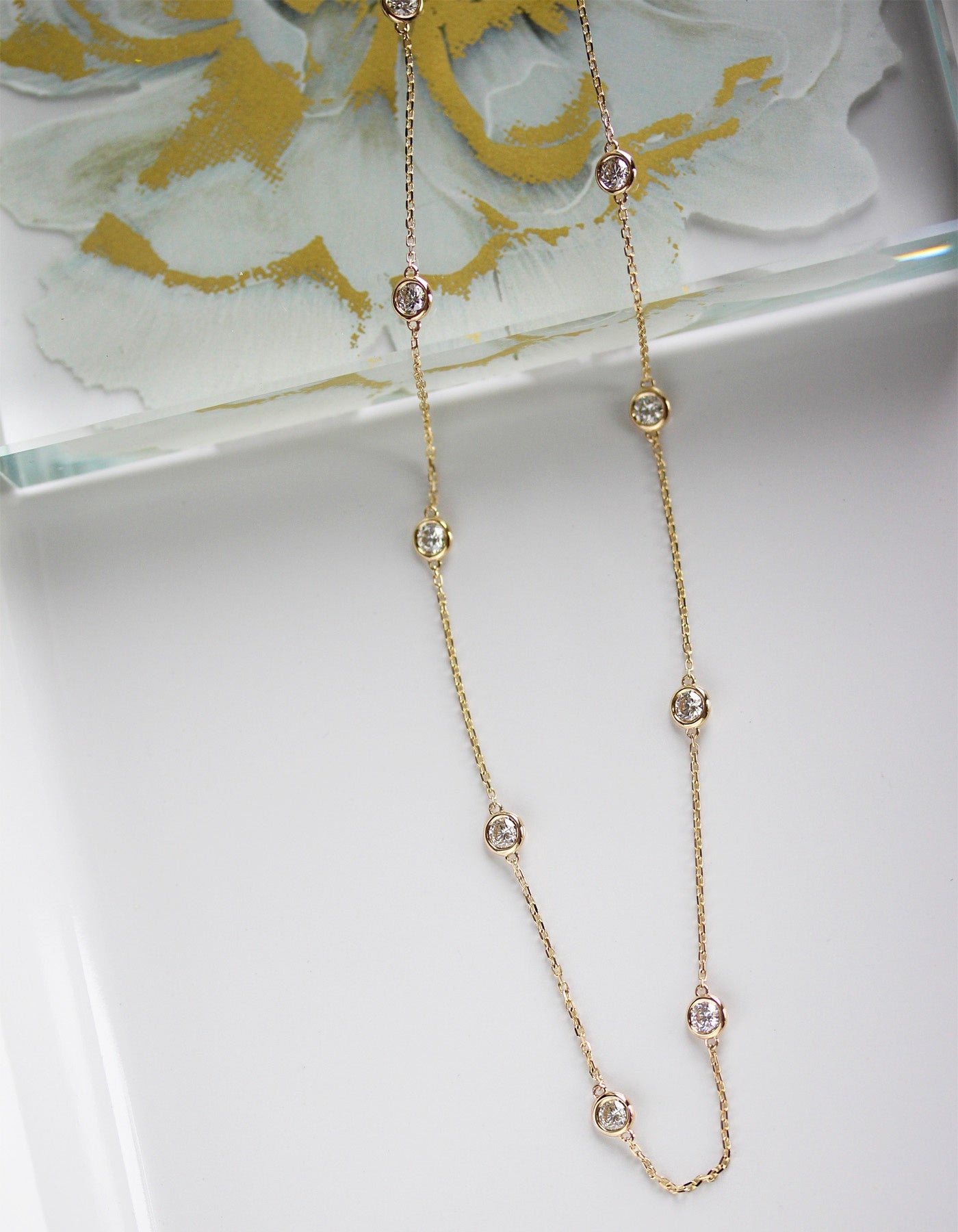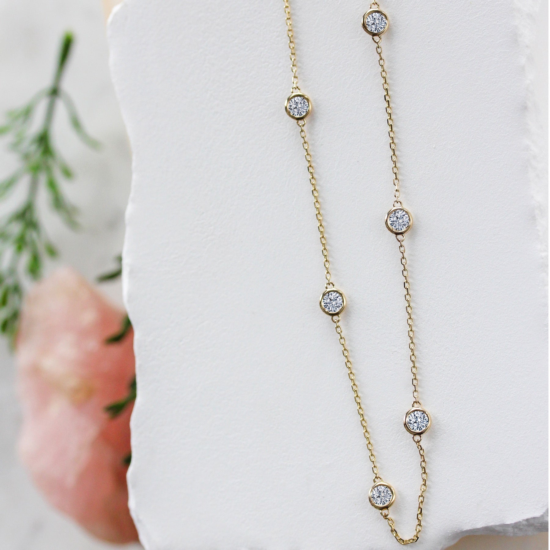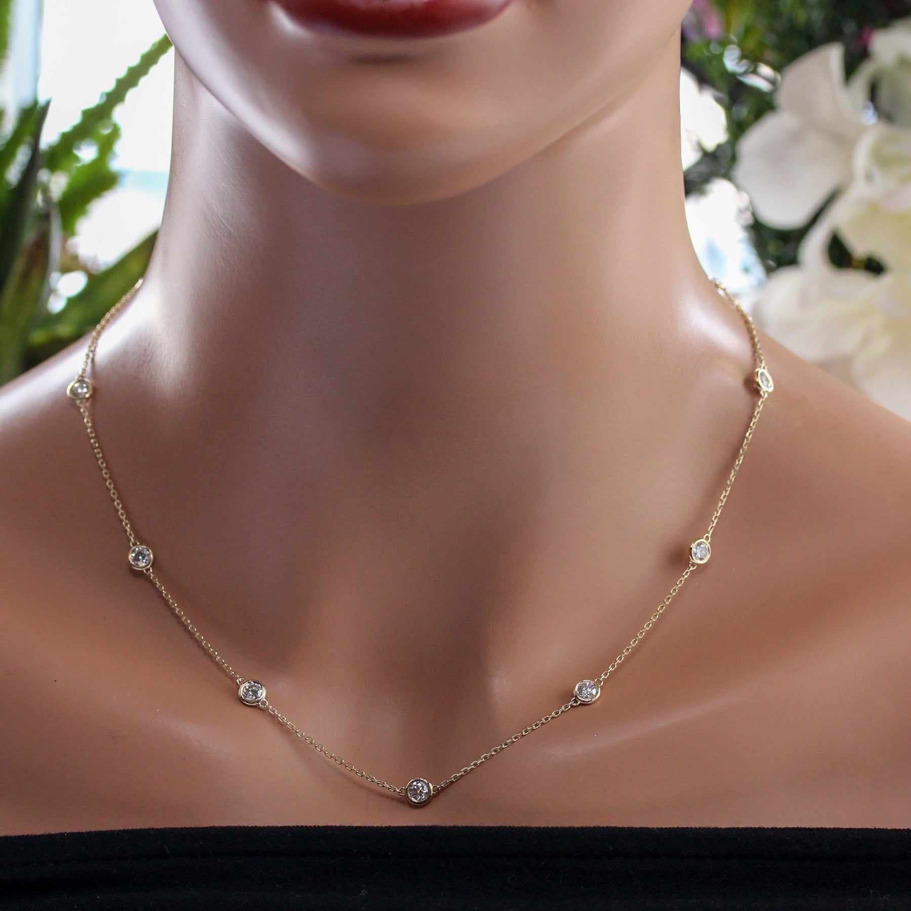 Bold brilliance in a timeless silhouette. This 14K yellow gold necklace features bezel-set diamonds totaling 2.30 carats, evenly spaced along a delicate chain for a refined yet substantial look.