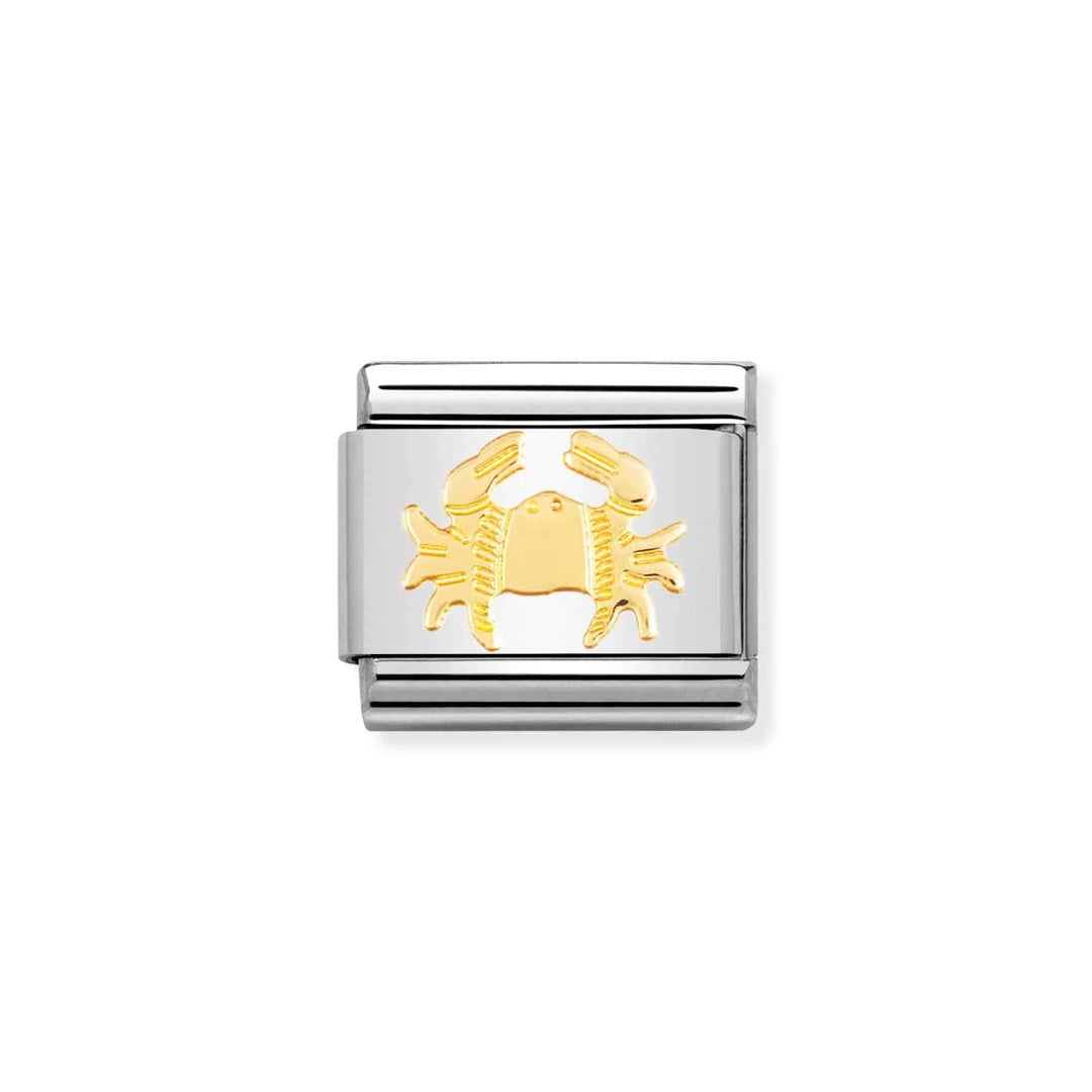 Original Zodiac Charm for Nomination's Composable Classic Bracelet with Cancer symbol in stainless steel and bonded yellow gold. All Zodiac symbols are available. Made in Italy. Cancer is a water sign: Sensitive, friend-oriented, practical.
