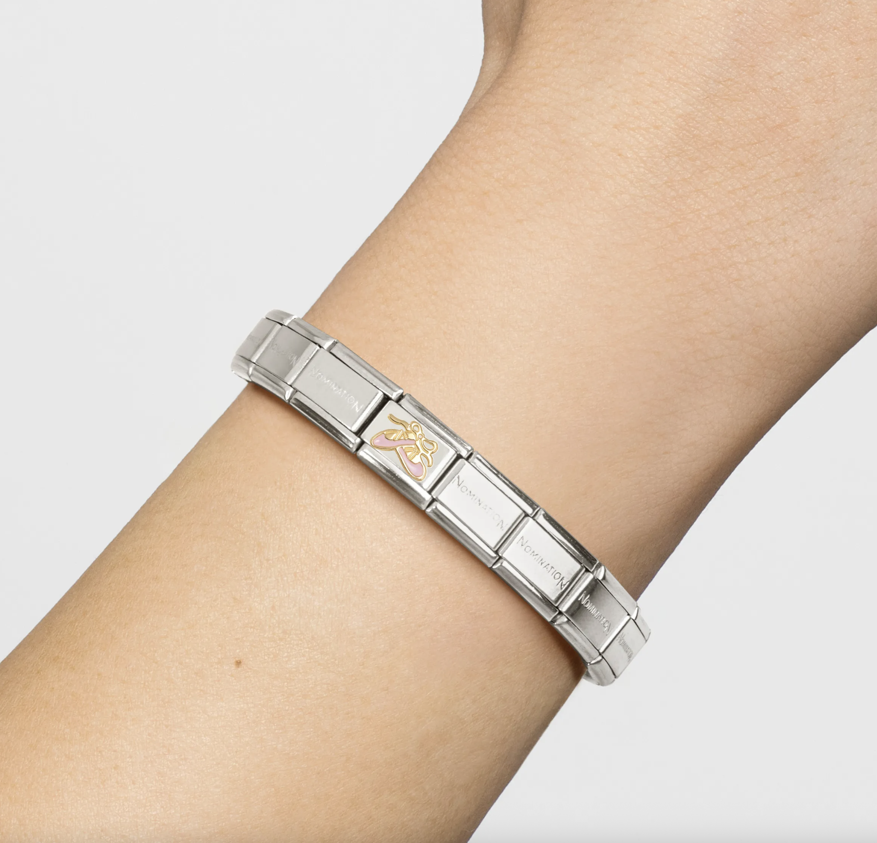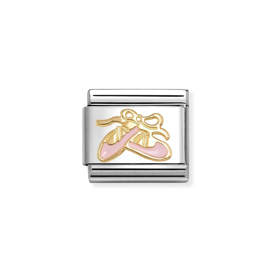 Original Nomination Composable Classic Link for Composable bracelet in stainless steel with yellow gold Dance Shoes symbol with Pink enamel. Show off your passion for ballet and classical dance with this Link.