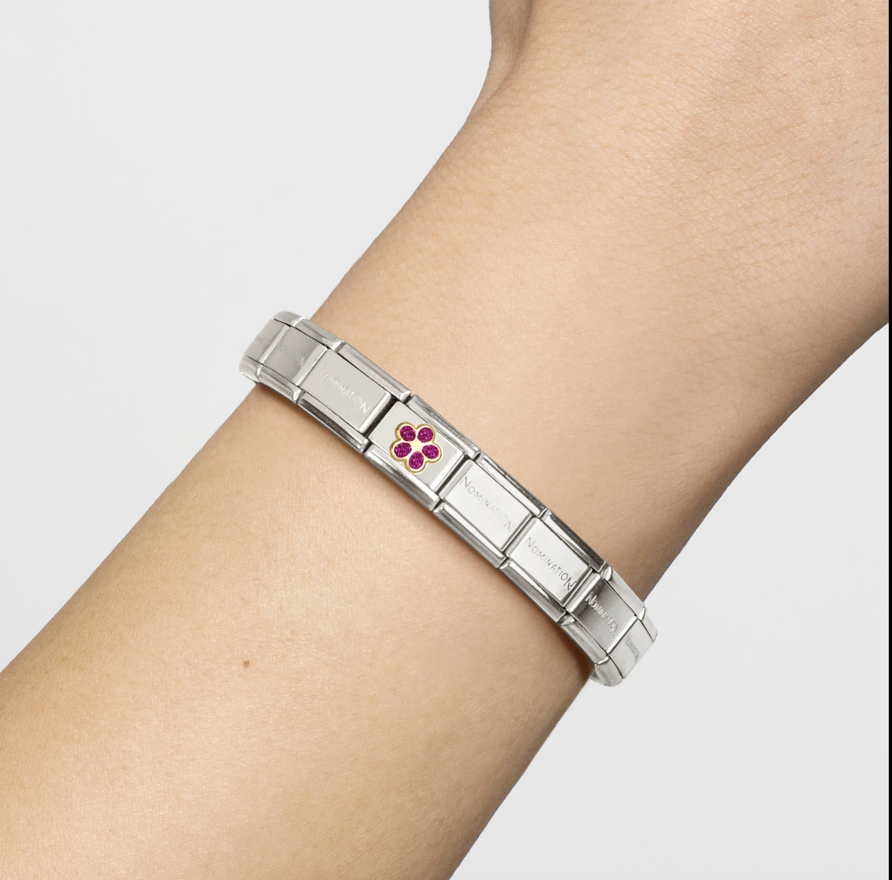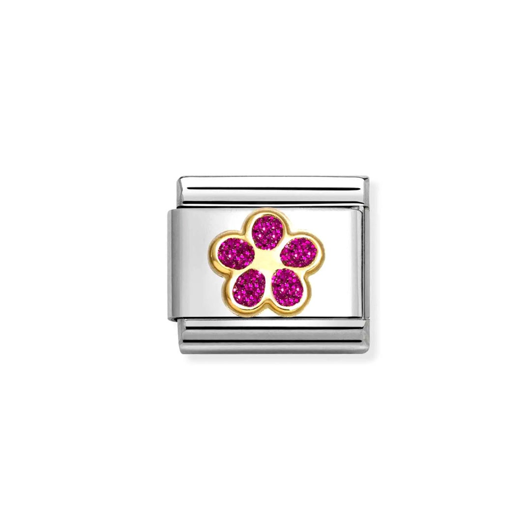 Original Nomination Classic Link in stainless steel and yellow gold with Flower symbol with Fuchsia Glitter. Bright and happy, that is the mood that this Link embodies - add a touch of both to your bracelet with this pretty Link.