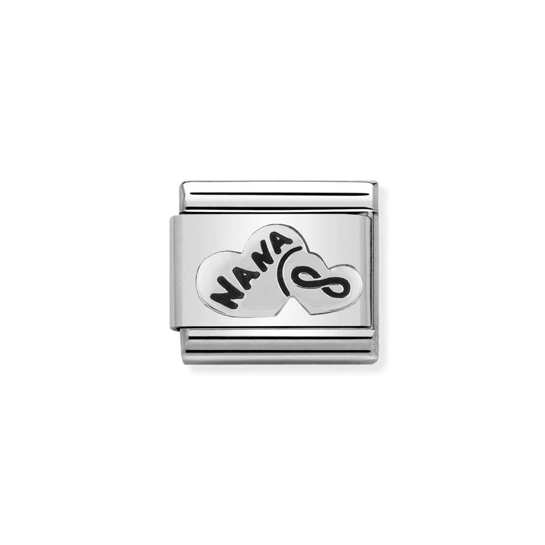 Original Charm for Nomination's Composable Classic bracelet in stainless steel and sterling silver with "Nana" Heart and Infinity symbol in black enamel. Made in Italy. Grandma is always ready to welcome you with open arms!