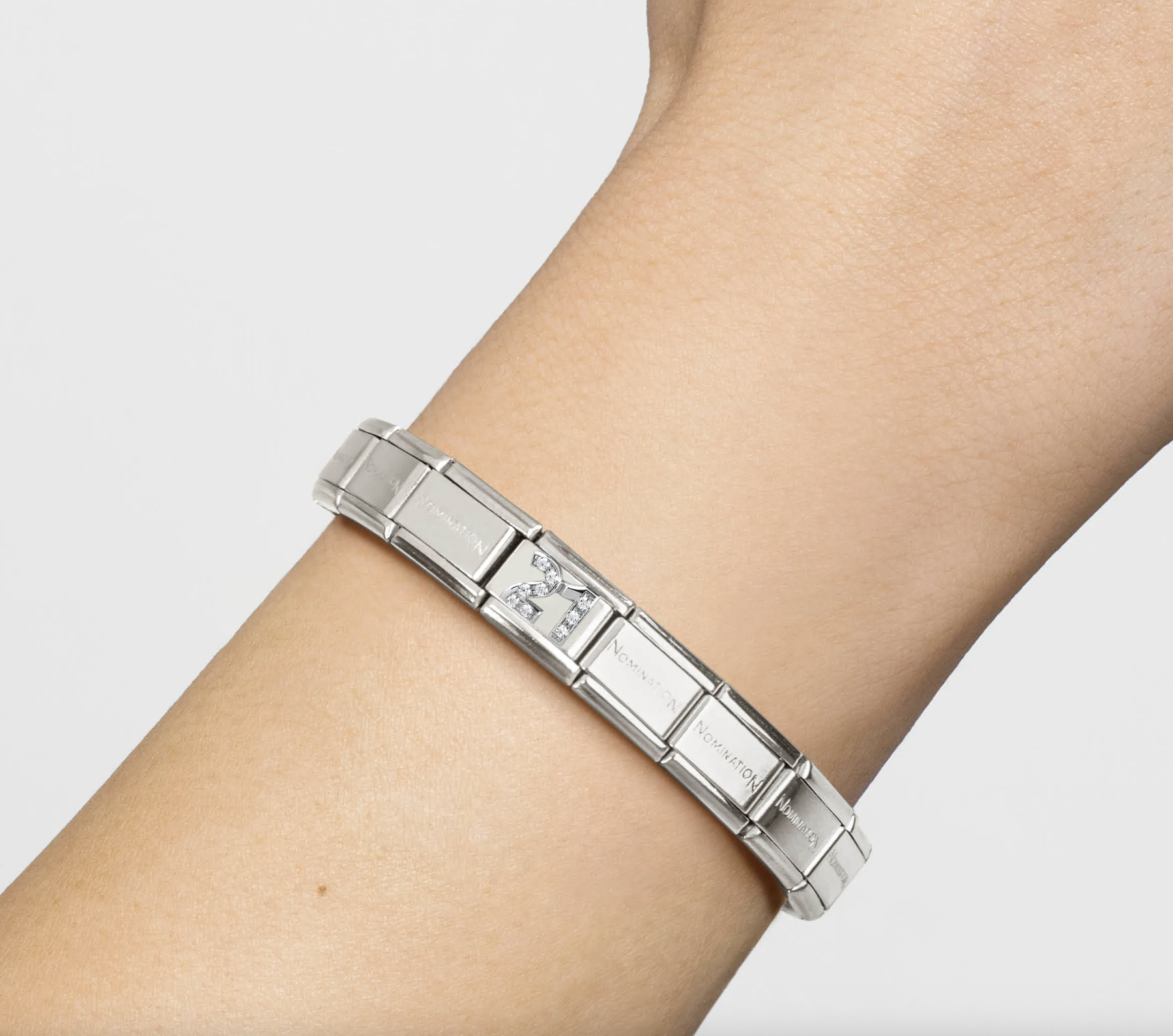 Composable Classic Charm for original bracelet in stainless steel, sterling silver and Cubic Zirconia with number twenty-one. Made in Italy. Celebrate this special occasion with a new link.