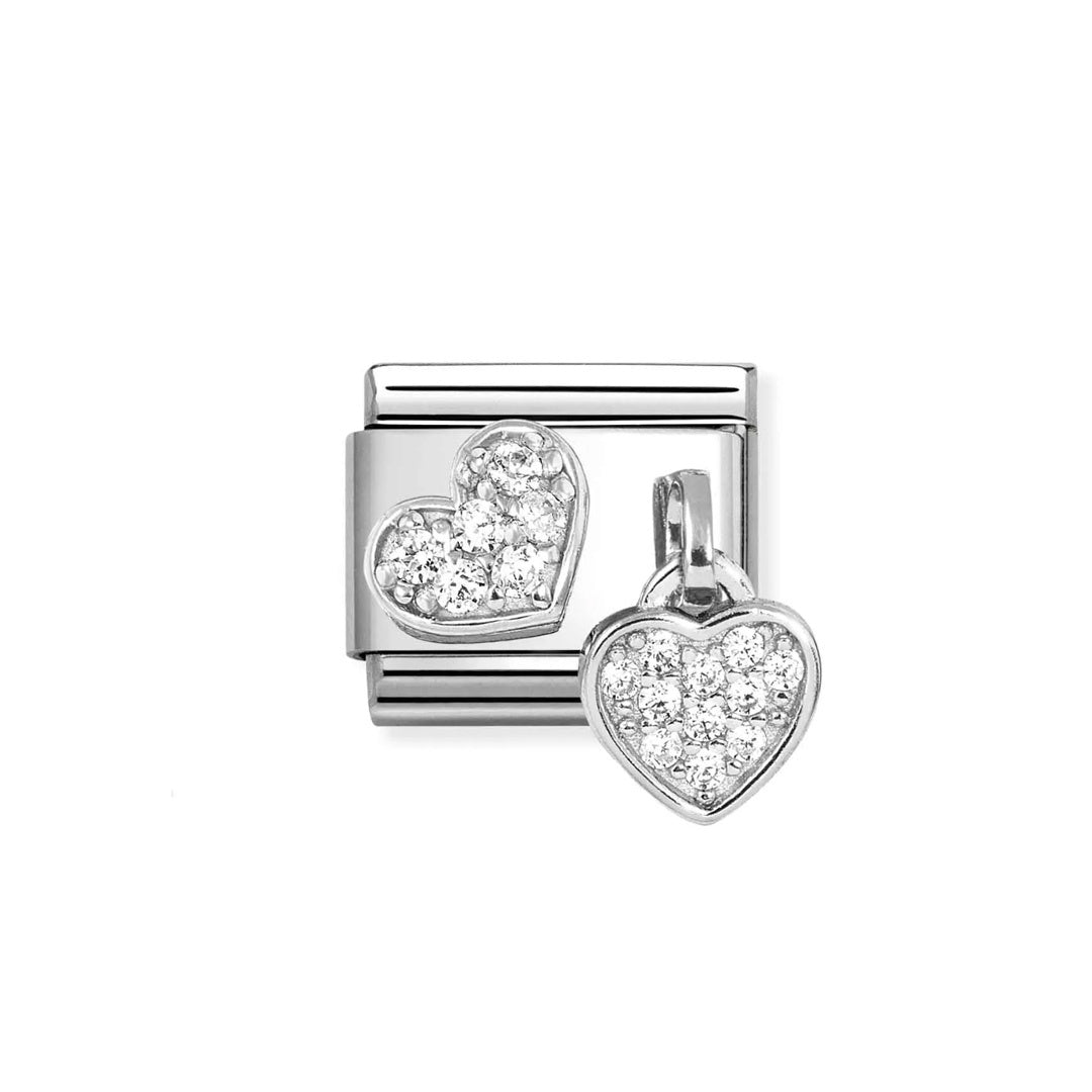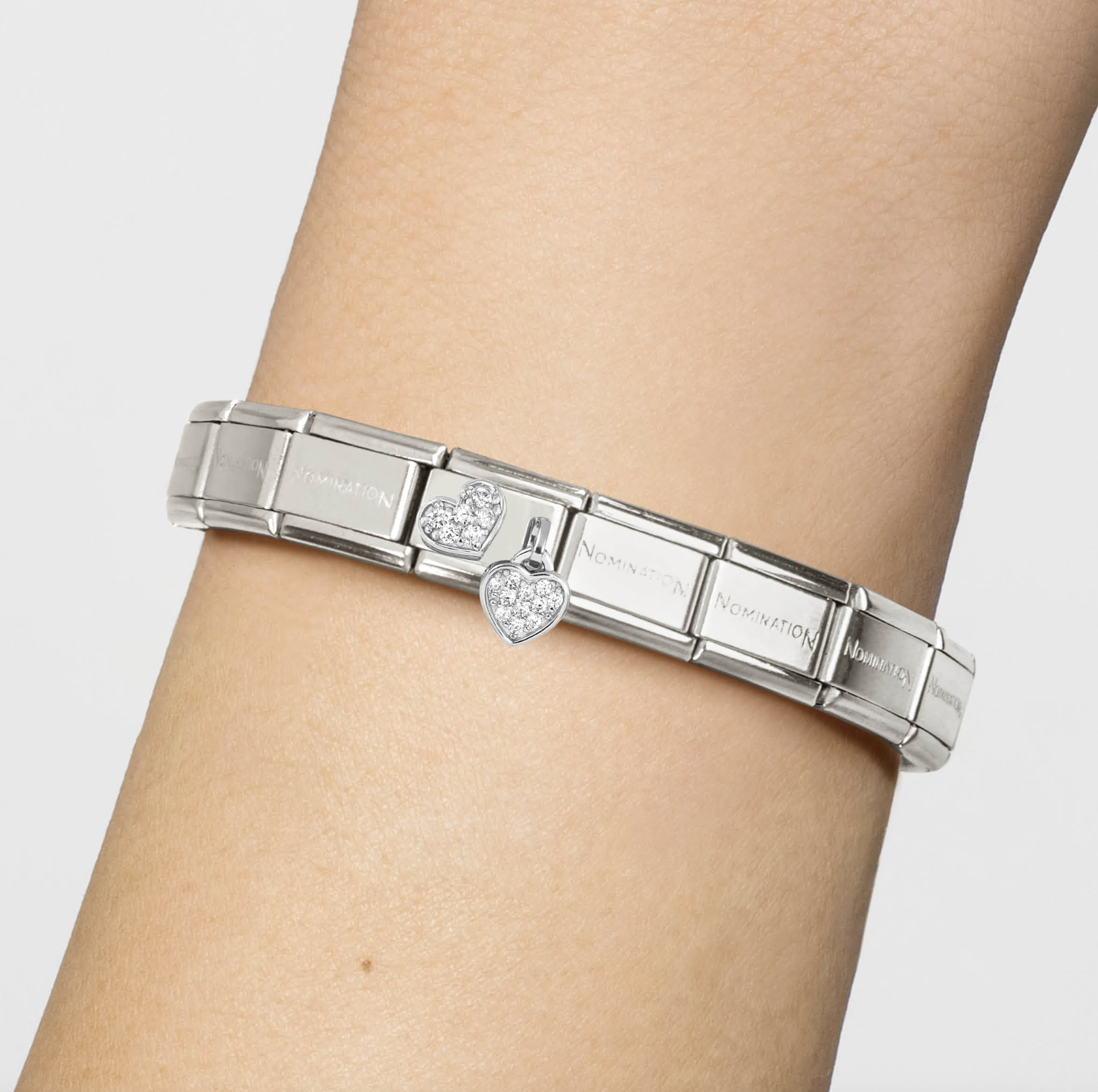 Original Nomination Composable Classic Link for Composable bracelet in stainless steel with sterling silver Heart symbol with White Cubic Zirconia and sterling silver Heart pendant with White Cubic Zirconia. Gift this LInk to someone special in your life. Rich with sparkling stones, this Link will remind them every day of how you feel.