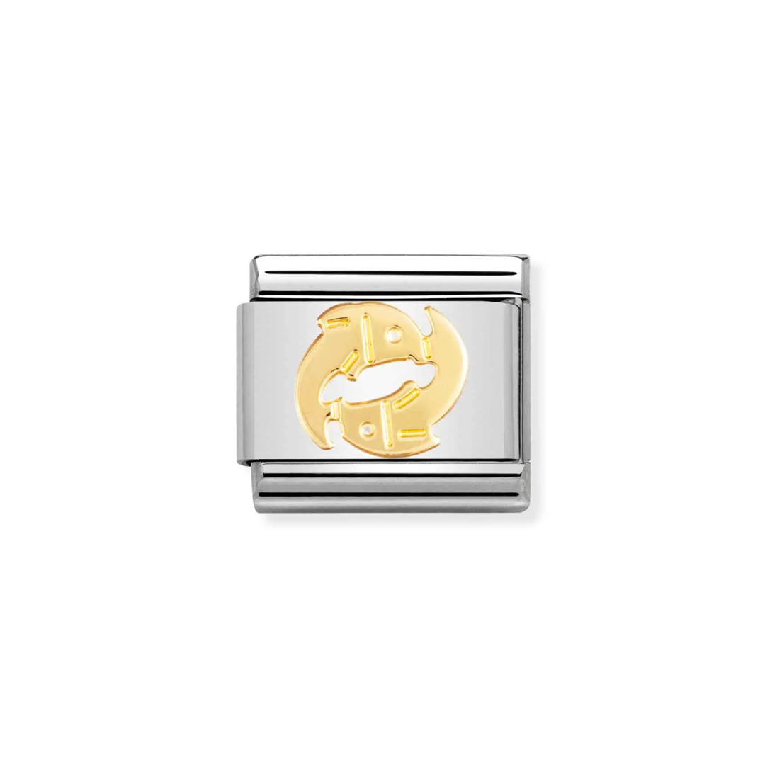 Original Zodiac Charm for Nomination's Composable Classic Bracelet with Pisces symbol in stainless steel and bonded yellow gold. All Zodiac symbols are available. Made in Italy. Pisces can be enigmatic and sometimes unreadable; complex and intriguing.