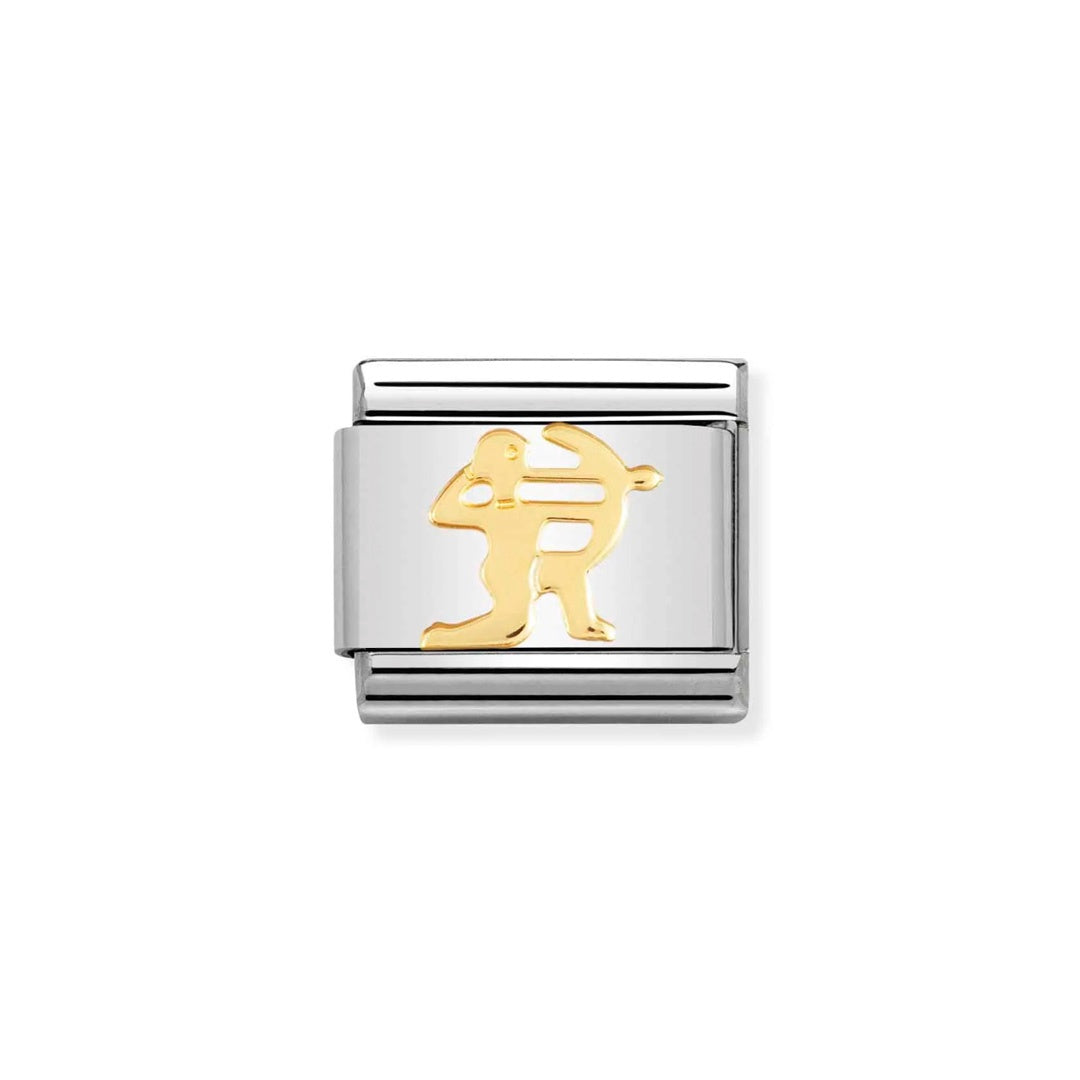 Original Zodiac Charm for Nomination's Composable Classic Bracelet with Sagittarius symbol in stainless steel and bonded yellow gold. All Zodiac symbols are available. Made in Italy. Sagittarius' element is fire. They have a strong character and they're generous.