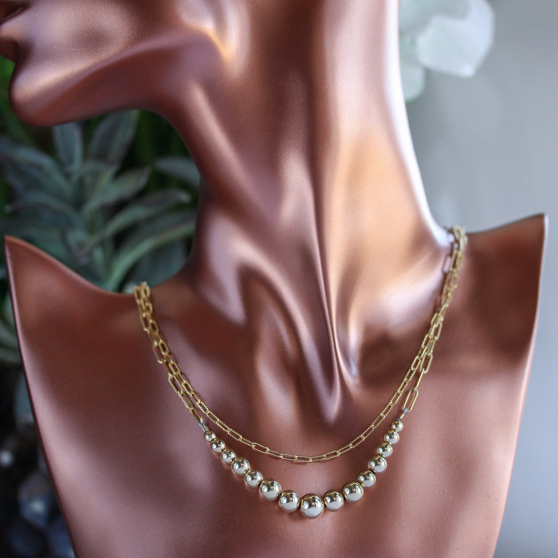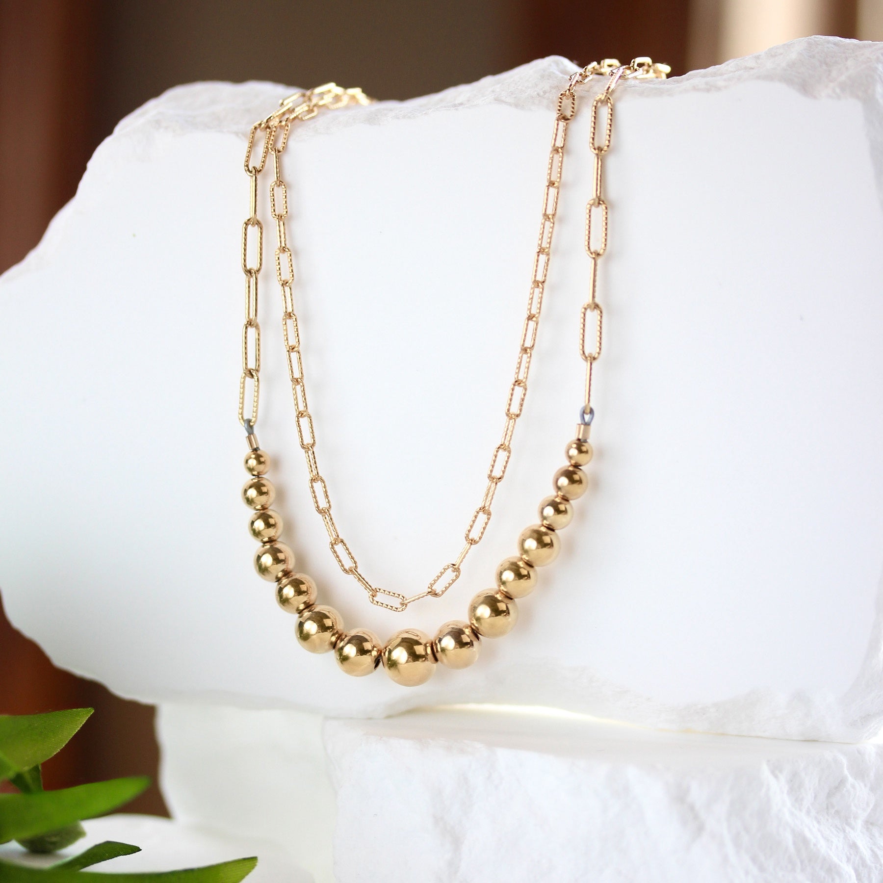 The front strand showcases a graceful curve of polished gold-filled beads in graduating sizes, creating a bold yet refined focal point. A second paperclip chain strand adds dimension and texture, giving the piece a contemporary layered look without the need to stack multiple necklaces.