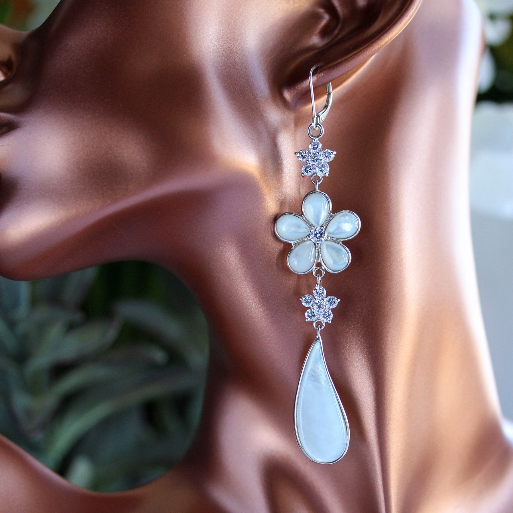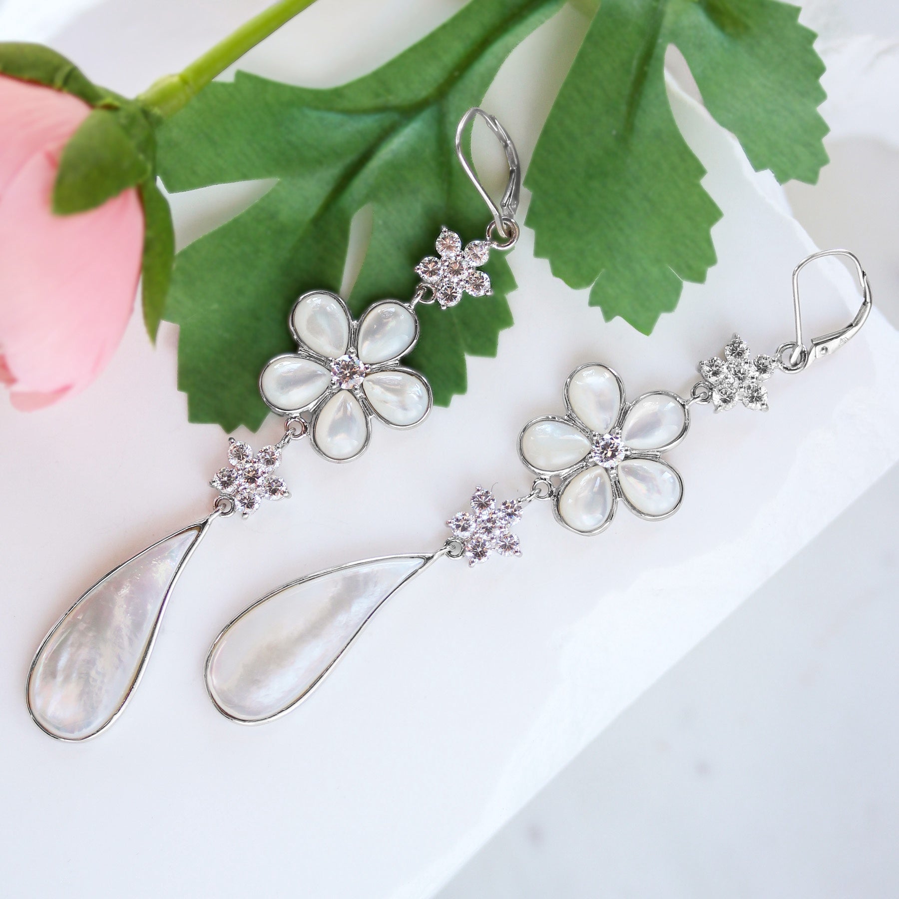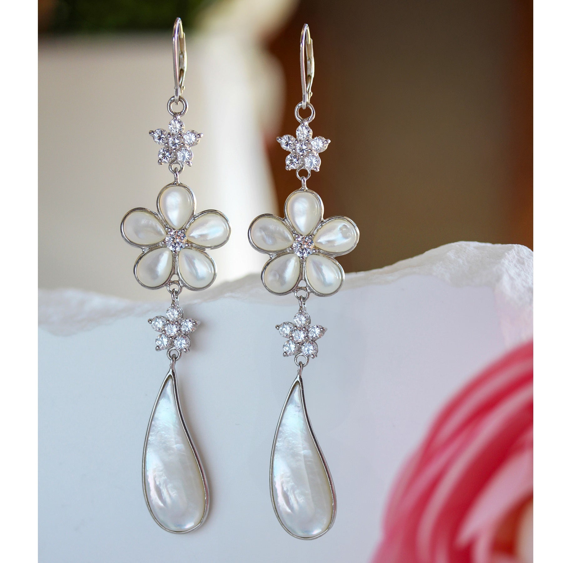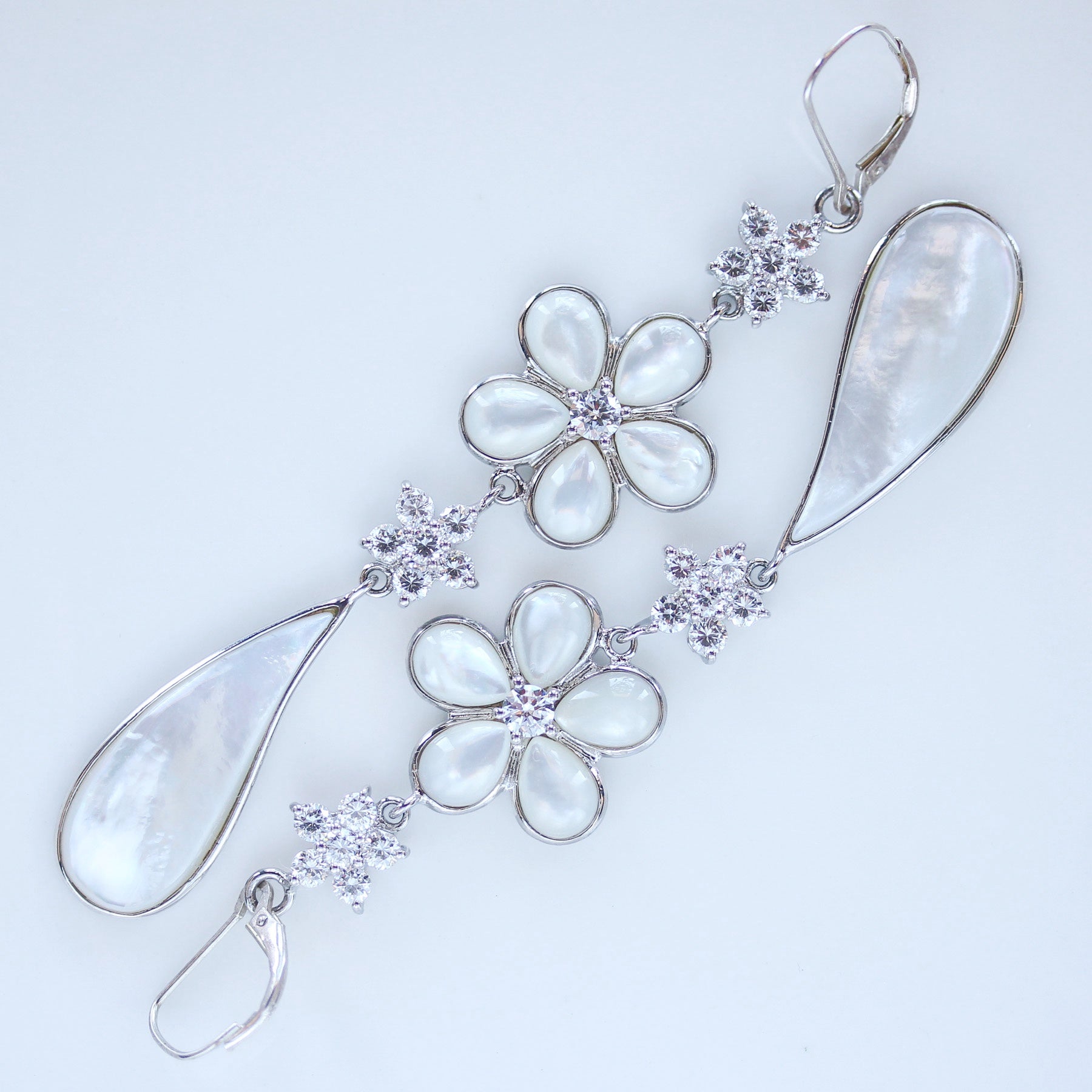 Delicate floral motifs feature iridescent mother of pearl petals that softly catch the light, accented with sparkling details for added brilliance. An elongated pear-shaped drop creates beautiful movement and elongates the neckline, giving these earrings a refined statement feel.