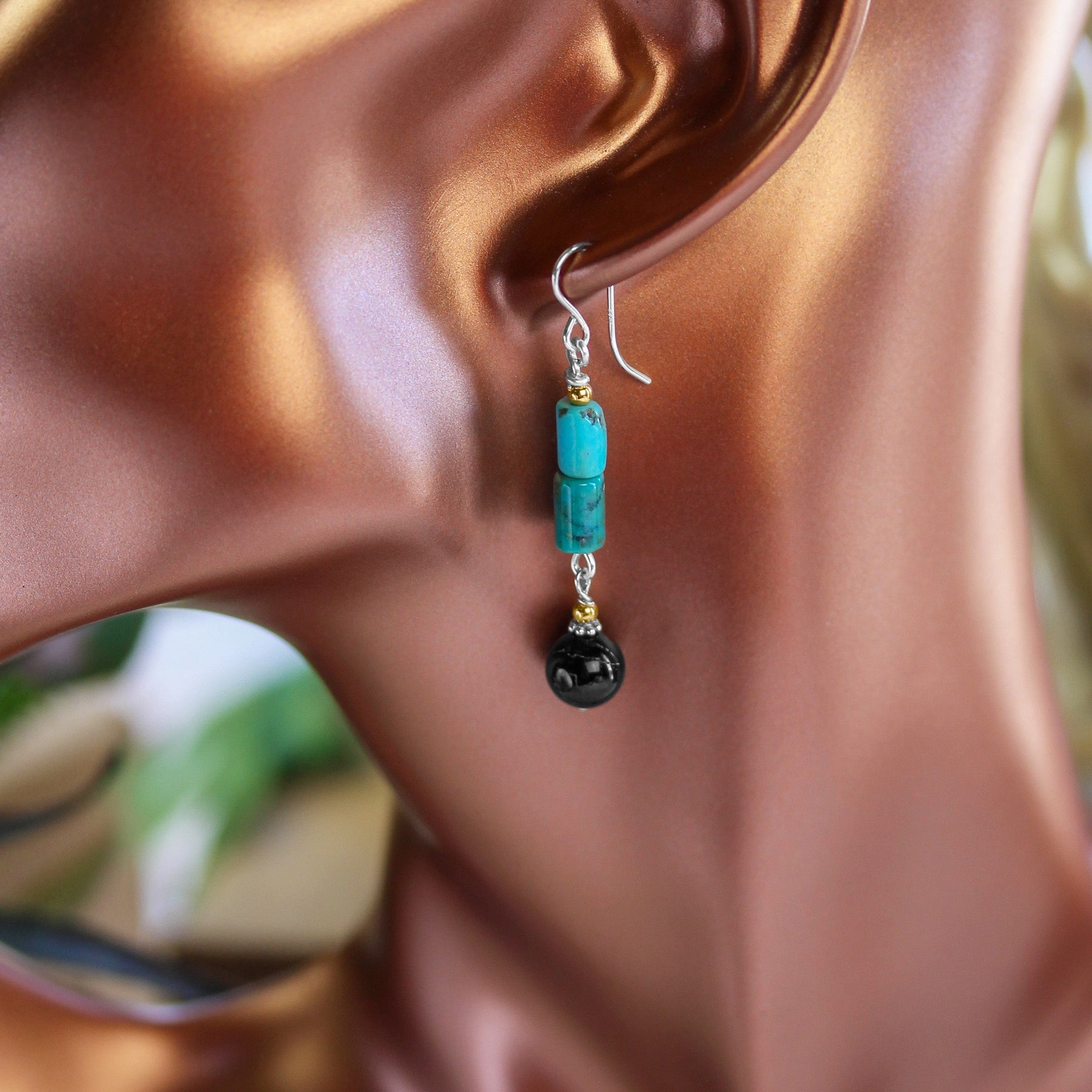 The vibrant turquoise adds a bright, natural pop of blue, while the polished black spinel bead creates depth and sophistication. Subtle gold accents bring warmth to the design, all finished on sterling silver French wires for graceful movement and comfortable wear.