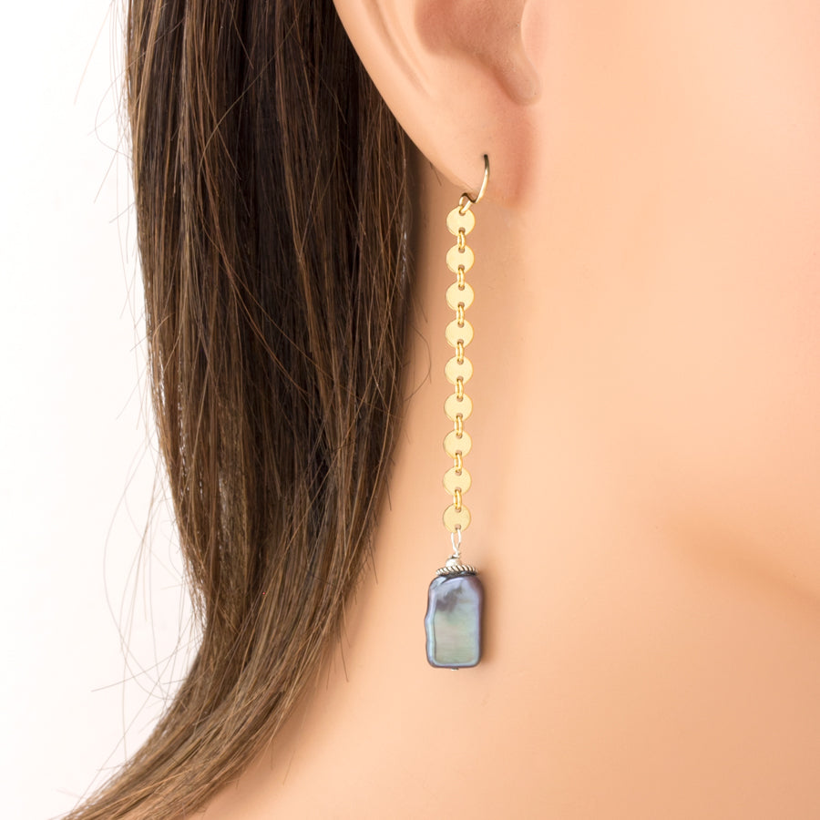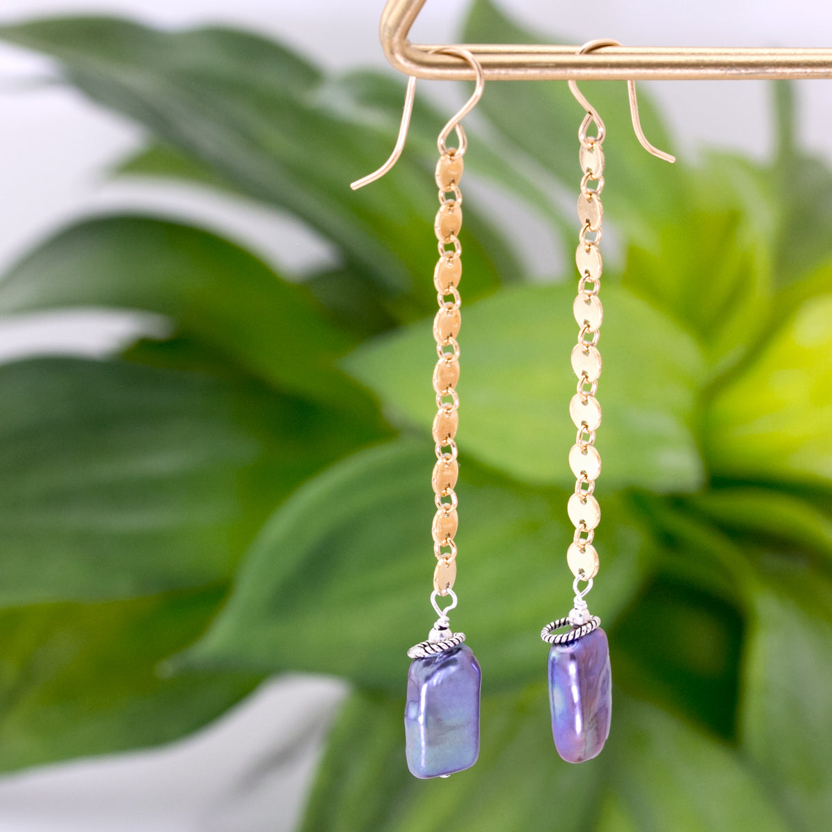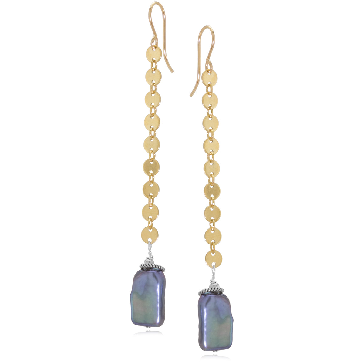 Freshwater peacock pearl rectangles with french wire, and a combination of 14K gold-fill and sterling silver accents.