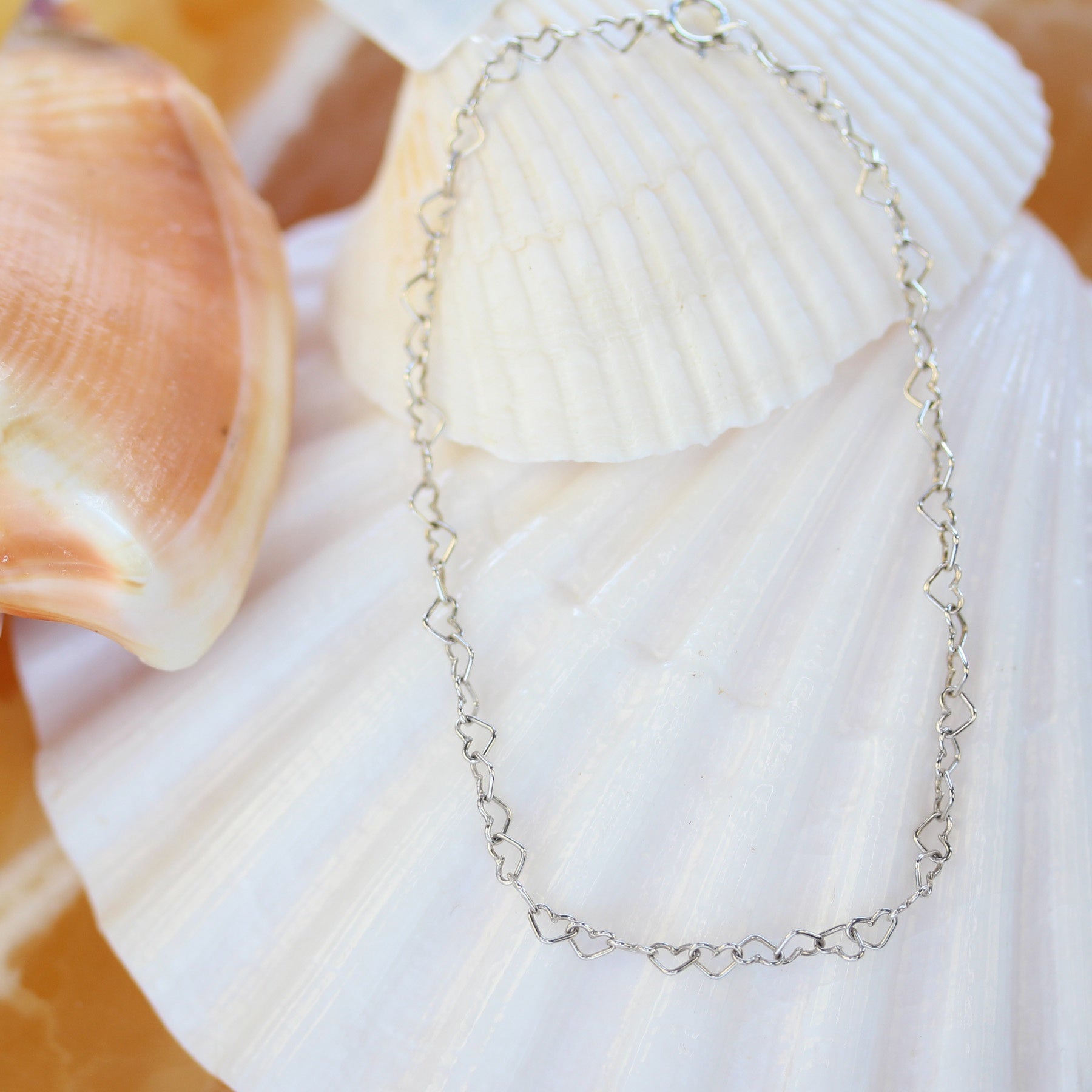 Sweet, airy, and made for sun-soaked days, the Dovie Anklet features a continuous strand of petite heart-shaped links crafted in polished sterling silver. The open-link design feels light and fluttery, catching the light with every step — like a little shimmer of love at your ankles.