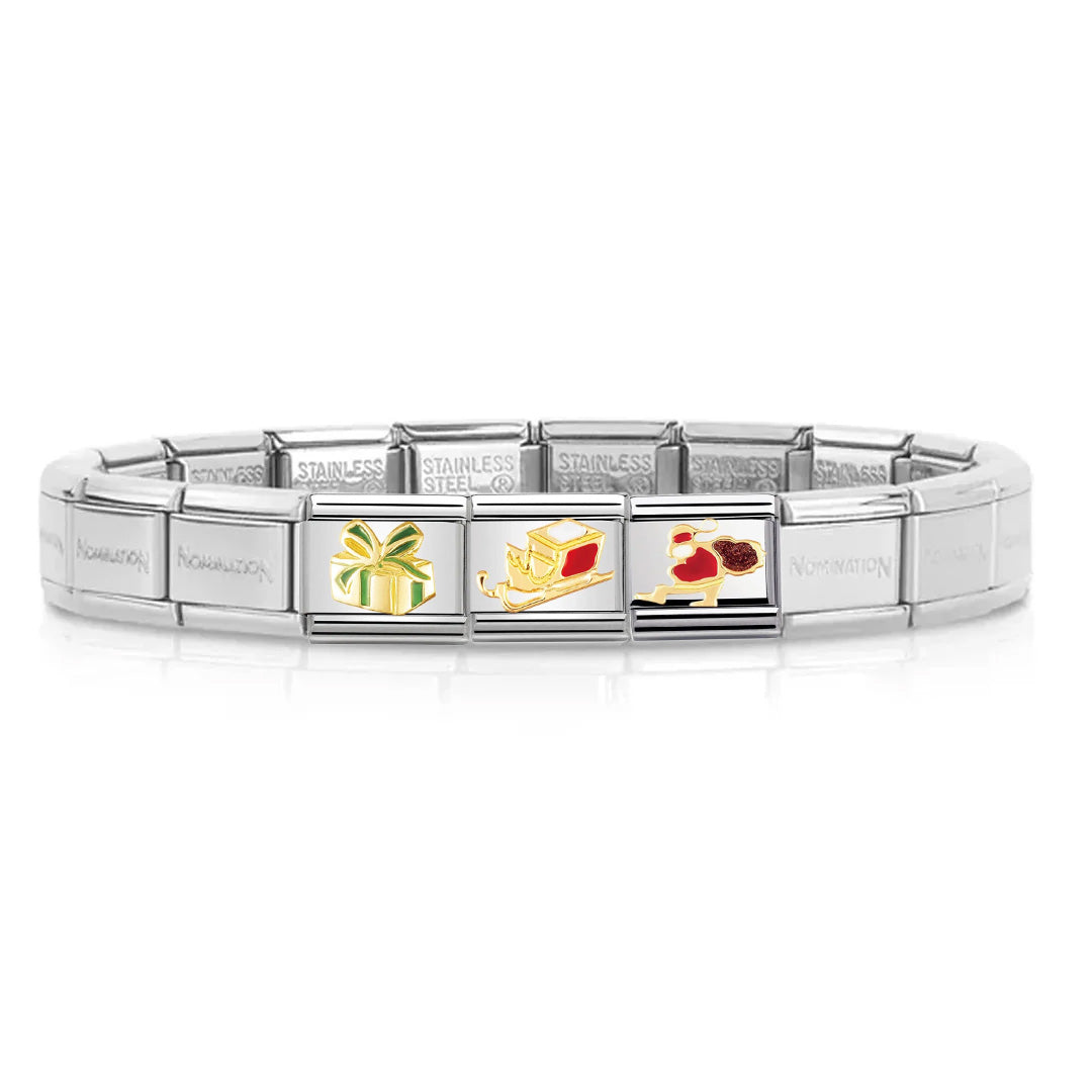 Capture the magic of Christmas Eve with the ’Twas the Night Before Christmas Composable Bracelet. This pre-built design features a stainless steel Classic base paired with three festive Nomination Classic Links: a shimmering green gift box, a traditional red-and-white sleigh, and a cheerful Santa Claus motif. Each link is detailed with 18k yellow gold accents and vibrant enamel for a nostalgic holiday glow.