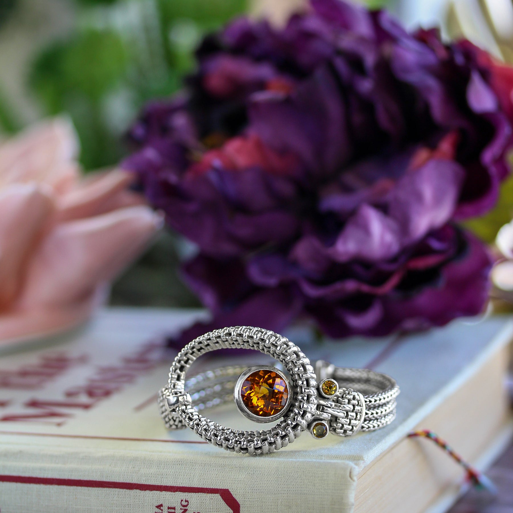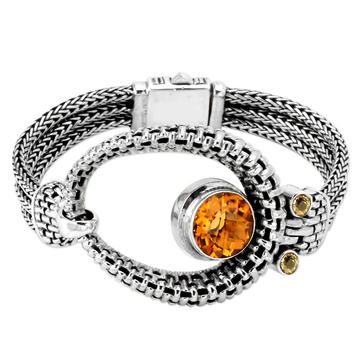 Bali Citrine Asymmetric Oval Bracelet featuring a bold faceted orange-yellow citrine gemstone set in a textured sterling silver oval design with intricate detailing, artisan handcrafted November birthstone jewelry.