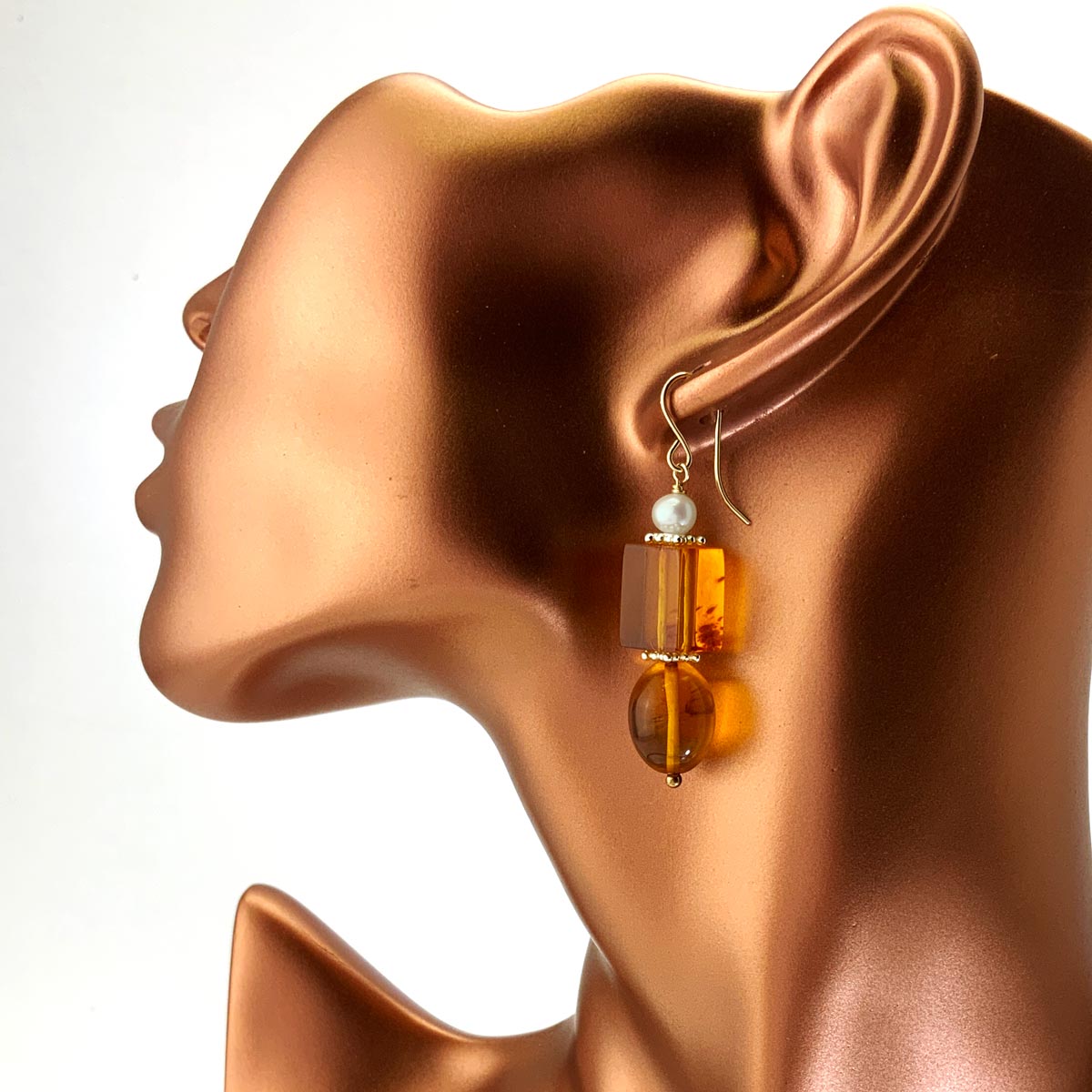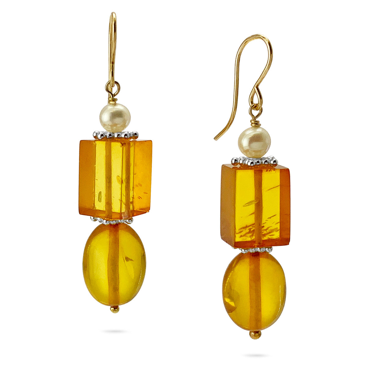 Baltic Amber earrings with freshwater pearls, sterling silver and 14KTGF accents.
