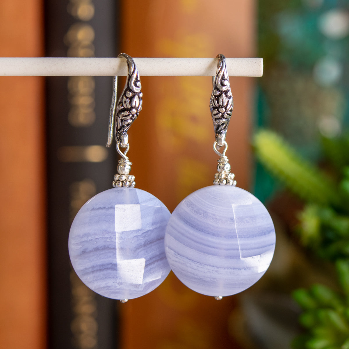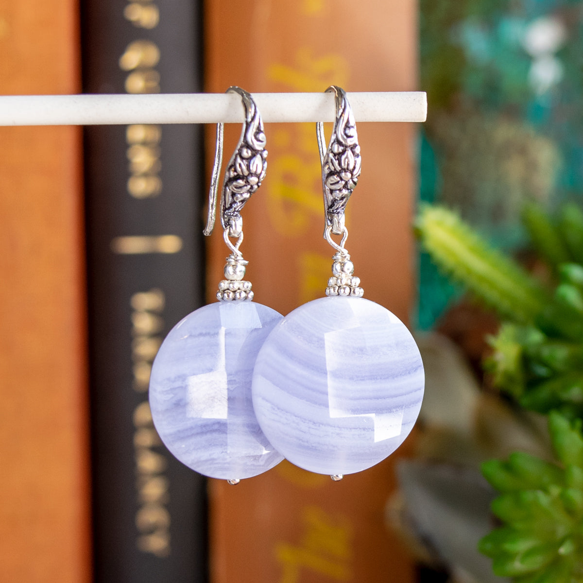 20mm faceted blue lace agate coin-shaped stones on fancy floral sterling silver wires.