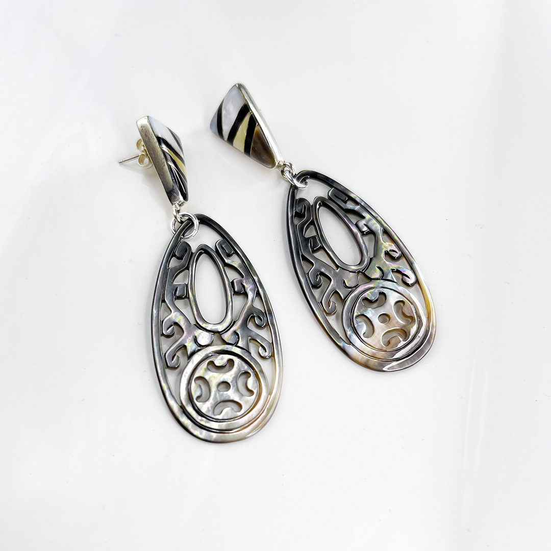 Beautifully carved mother of pearl teardrop earrings on inlay mother of pearl posts, showcasing four natural colors.