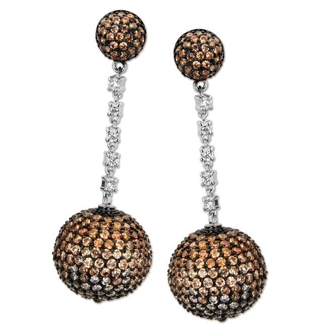 Chocolate/Tawny & Clear Cubic Zirconia Spherical Dangle Bling Sterling Silver Earrings.