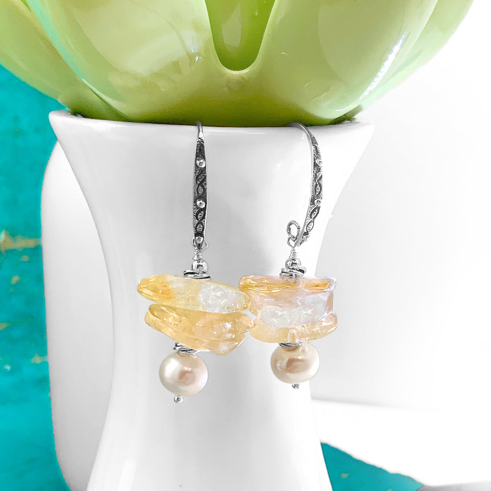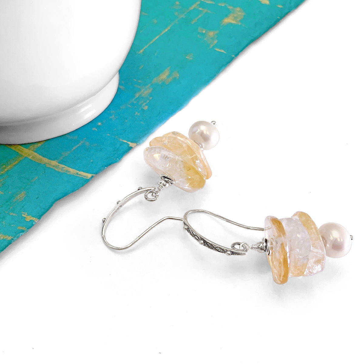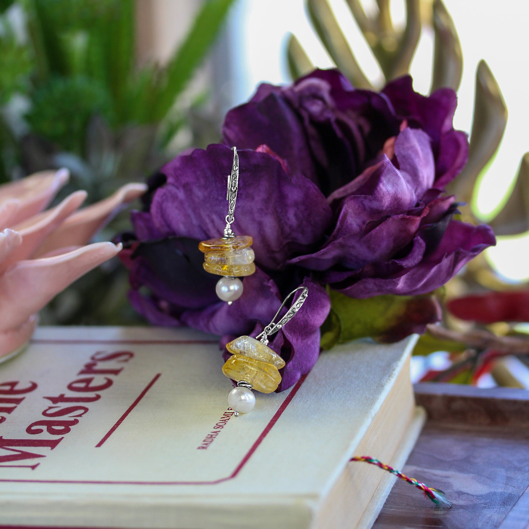 Elisa Ilana Citrine birthstone drop earrings featuring stacked golden citrine gemstones with freshwater pearl accents and sterling silver hooks, handcrafted November jewelry that adds warm yellow sparkle and timeless elegance.