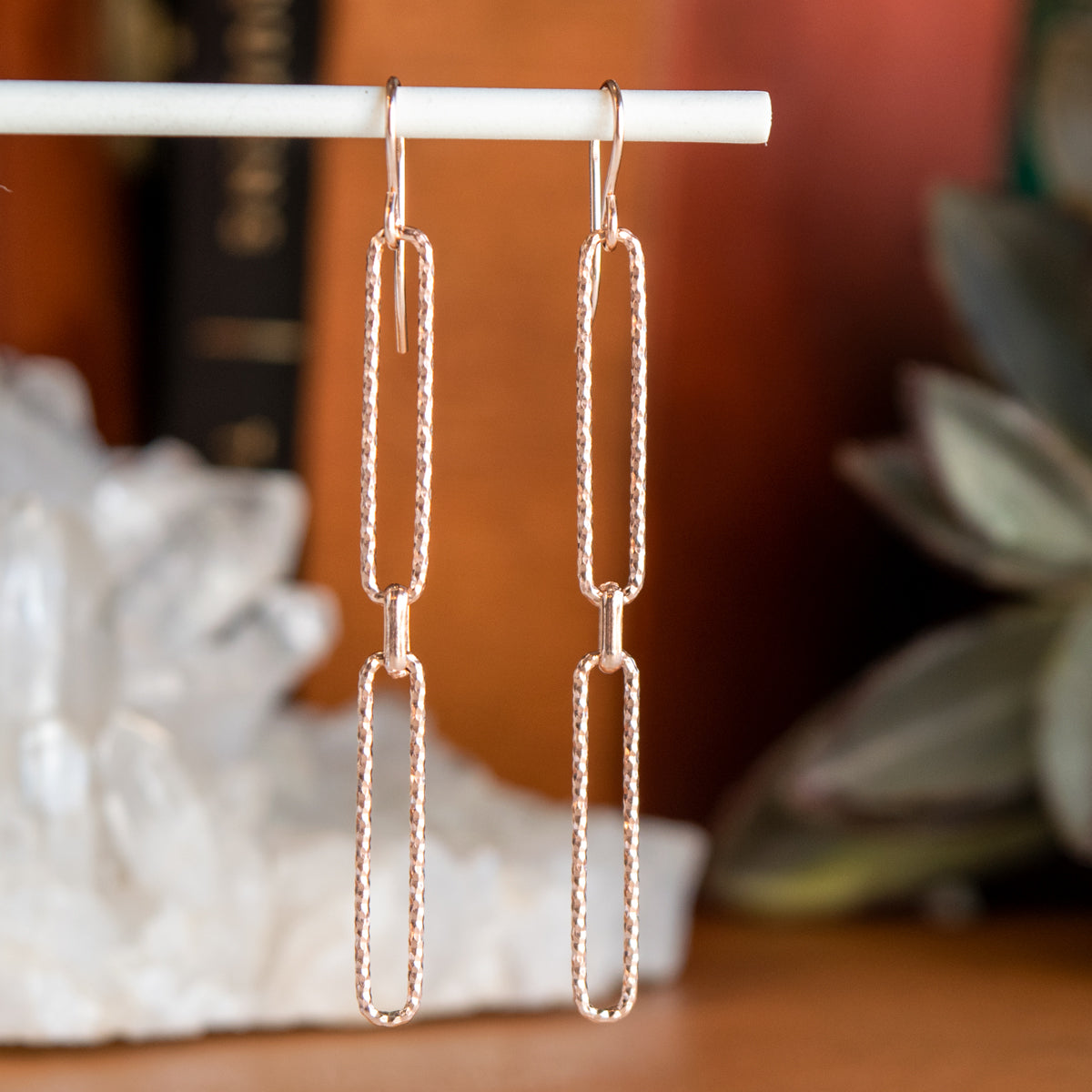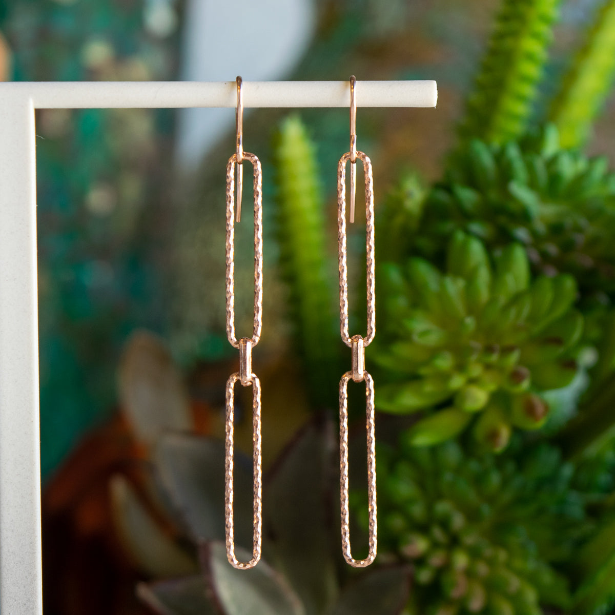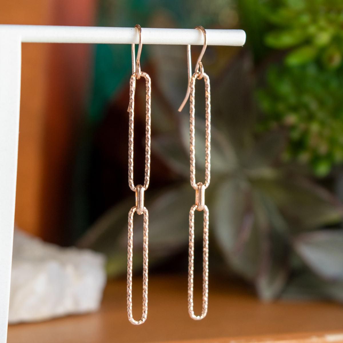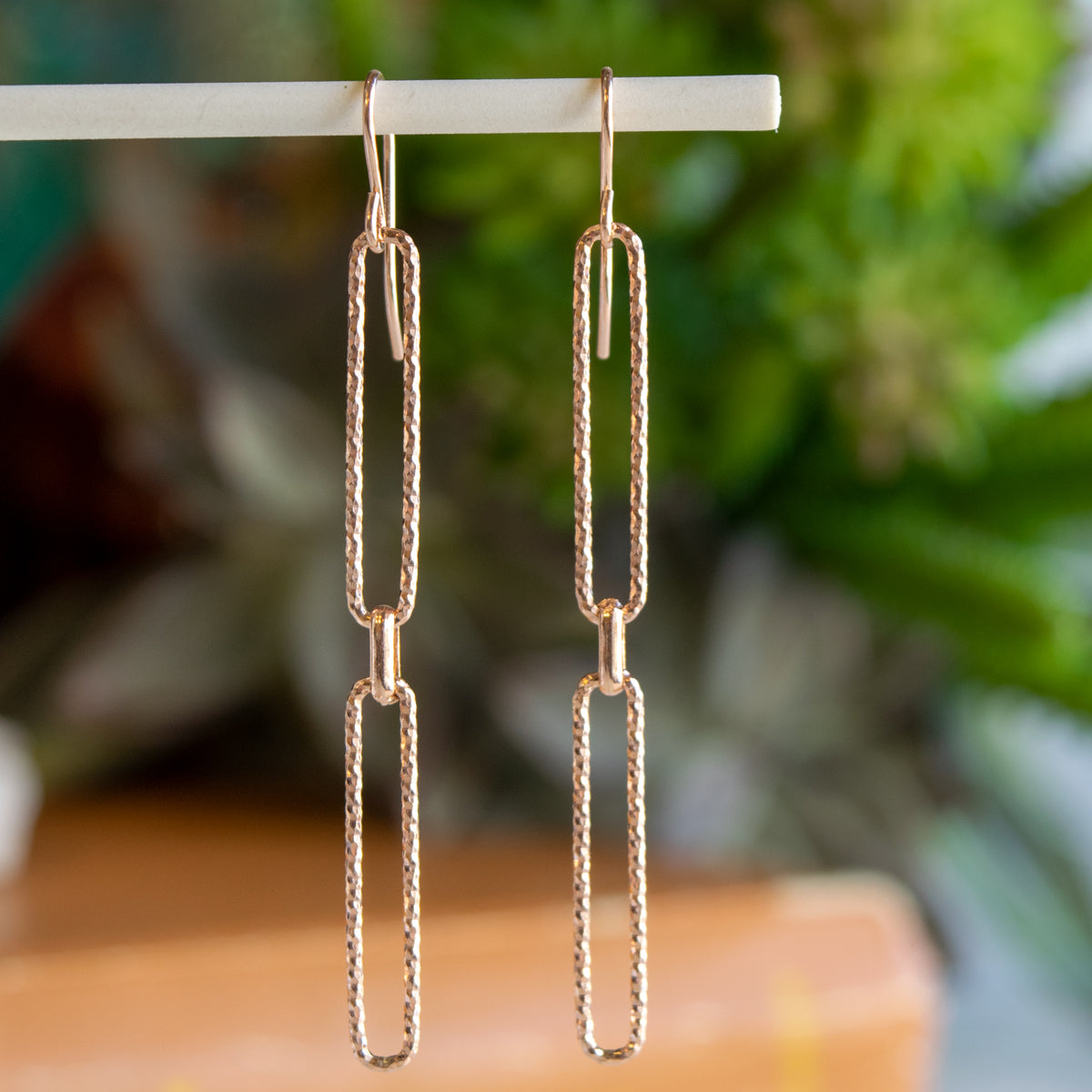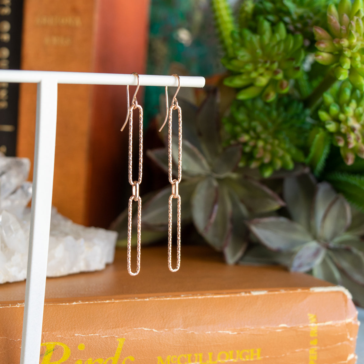 14KT Rose Gold-Filled elongated paperclip chain earrings.