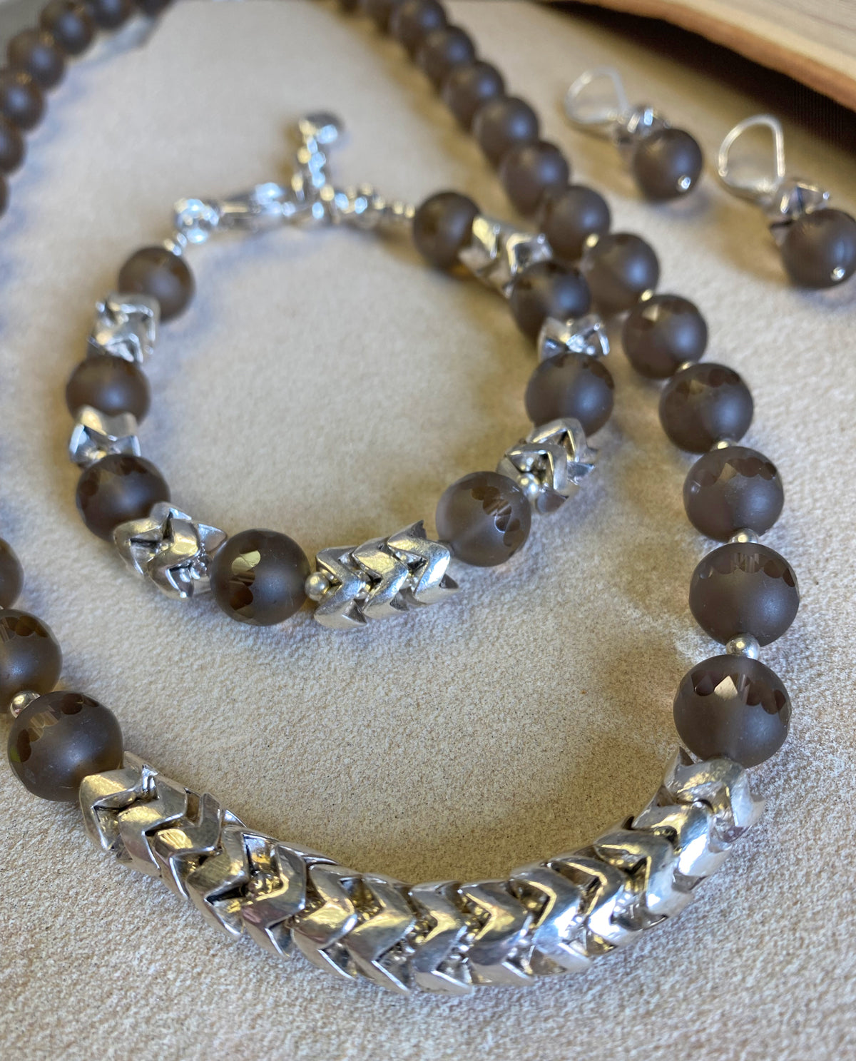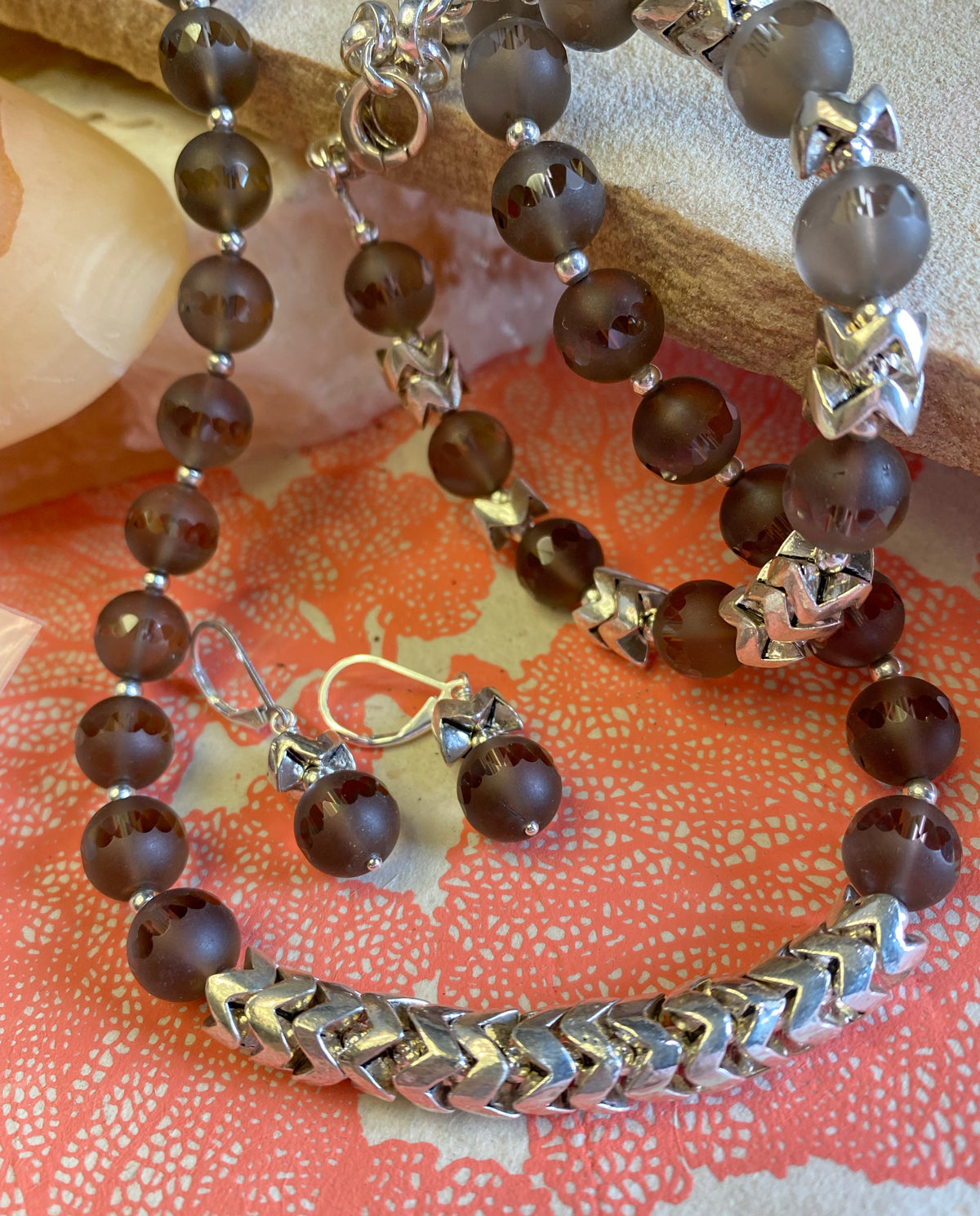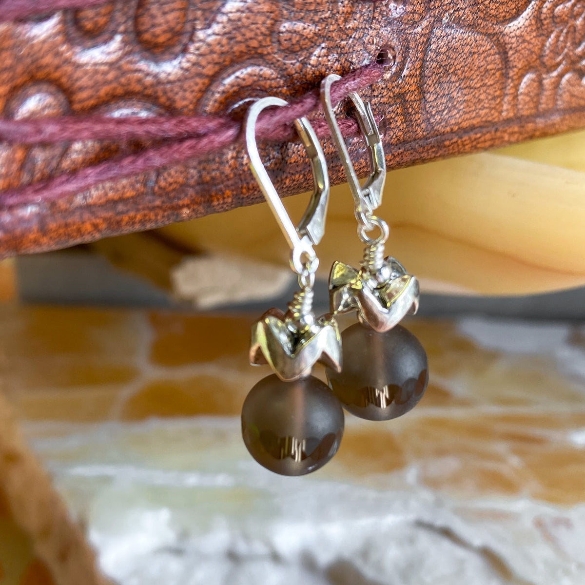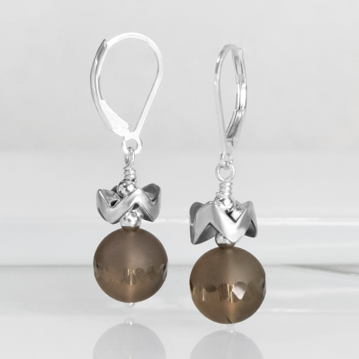 Carved frosted smoky quartz sterling silver leverback earrings. Coordinating necklace and bracelet, 11377N & 11377B.