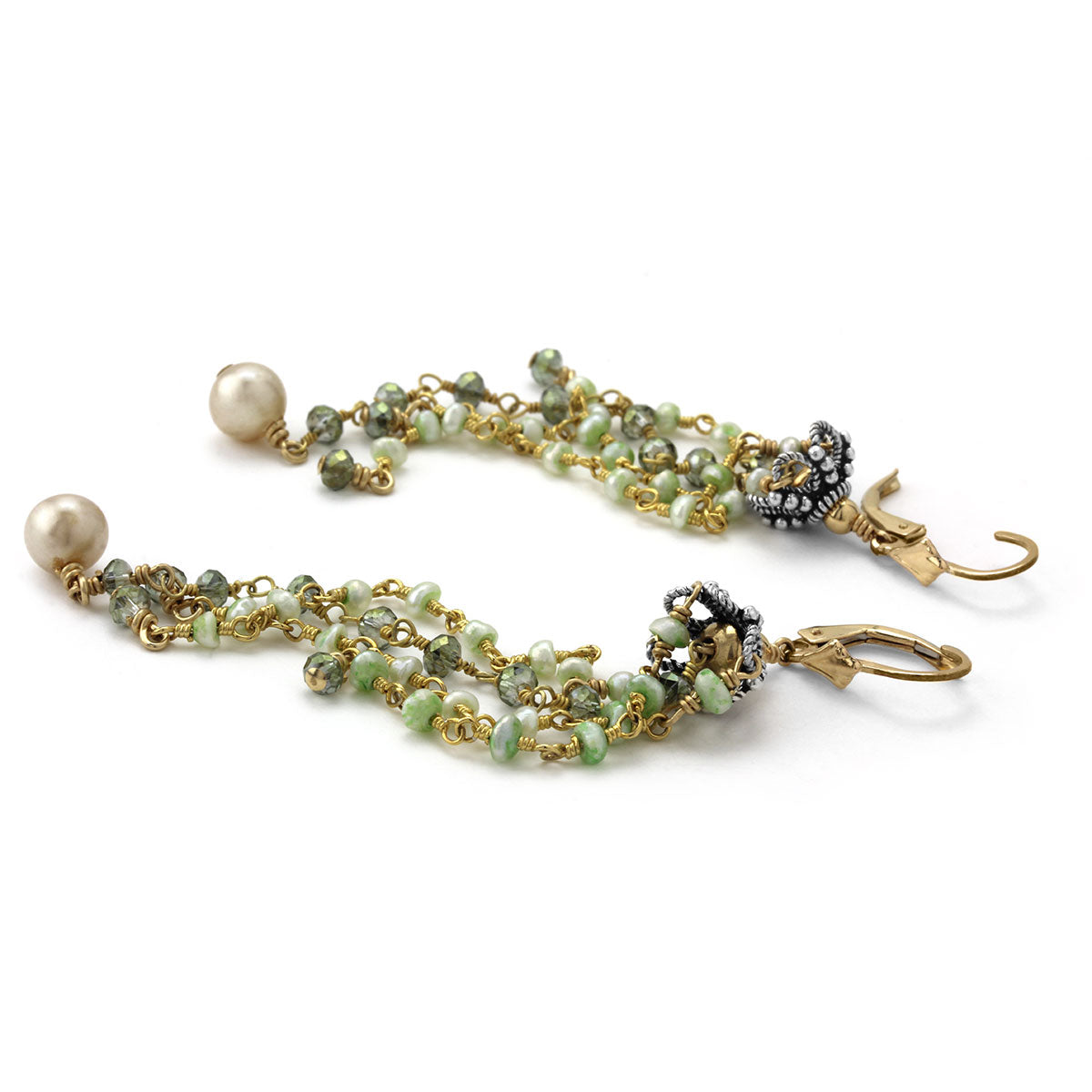 Add a touch of warm tones to your ensemble with these beautiful earrings that feature 14KTGF and Sterling Silver dropped with Green Crystal and Pearl accents!