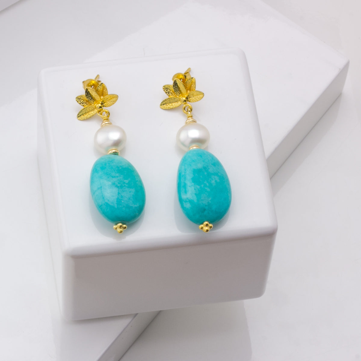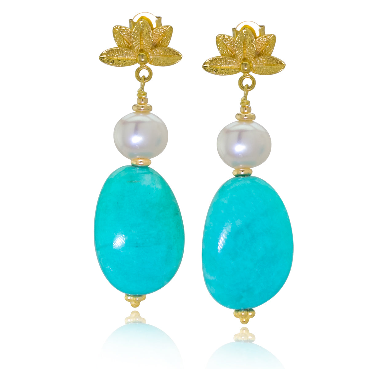 Vibrant amazonite looks breathtaking against a freshwater pearl and the gold vermeil lotus.