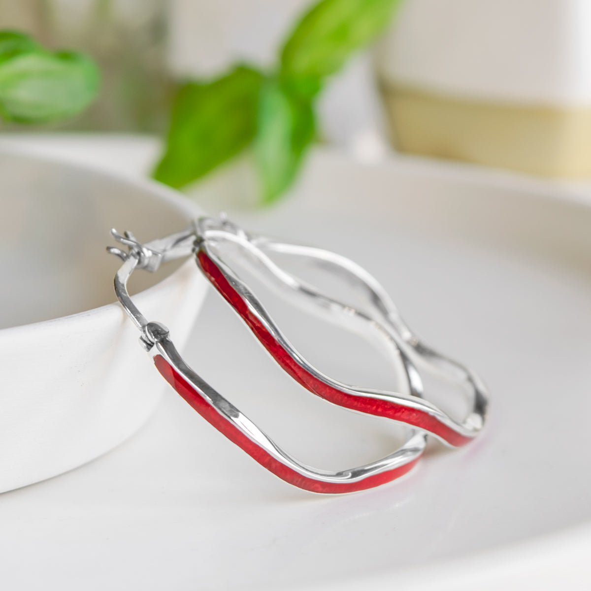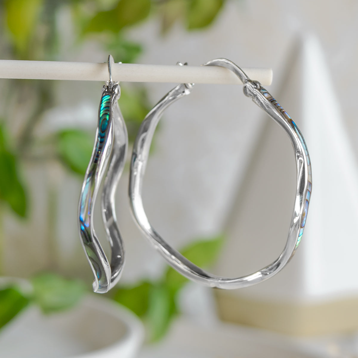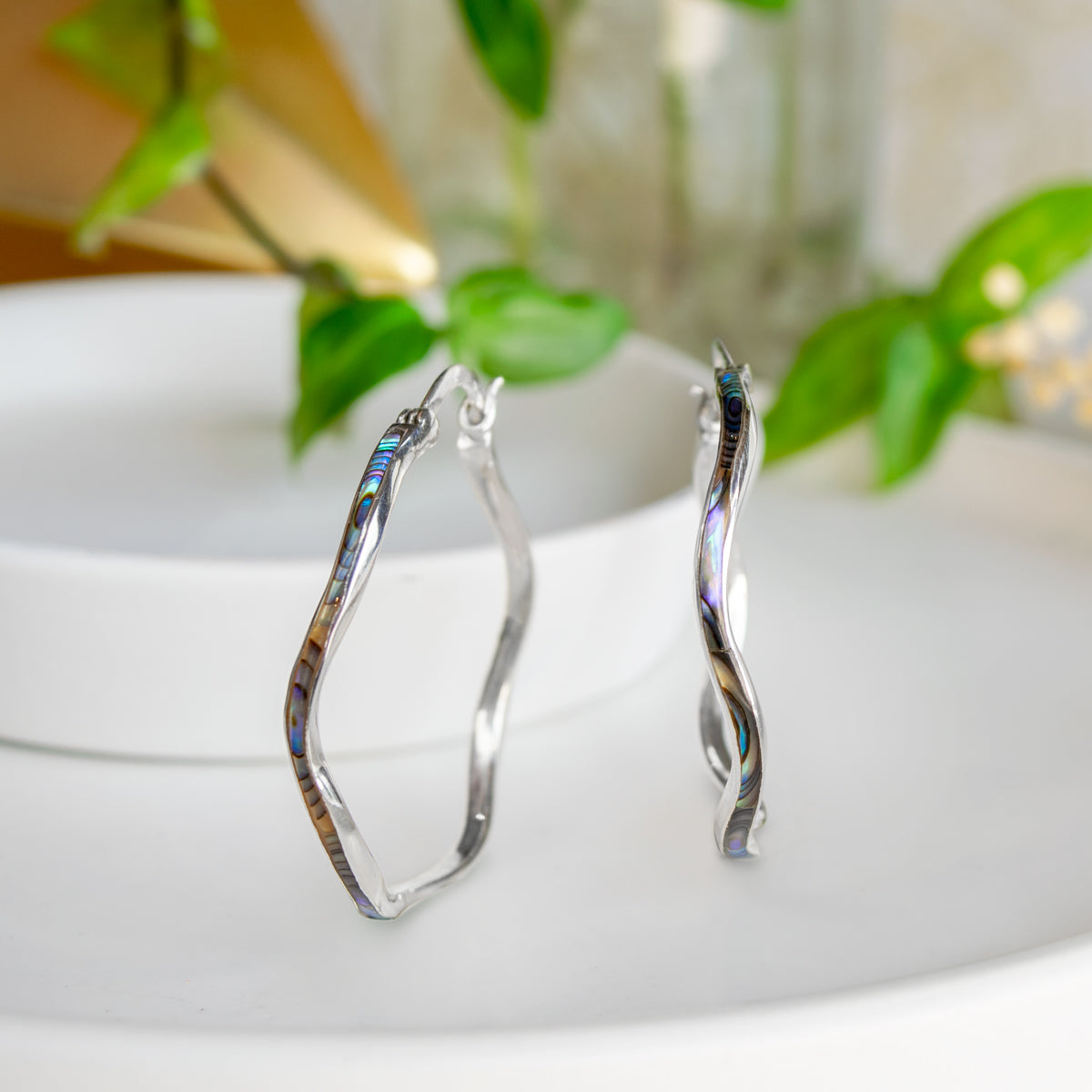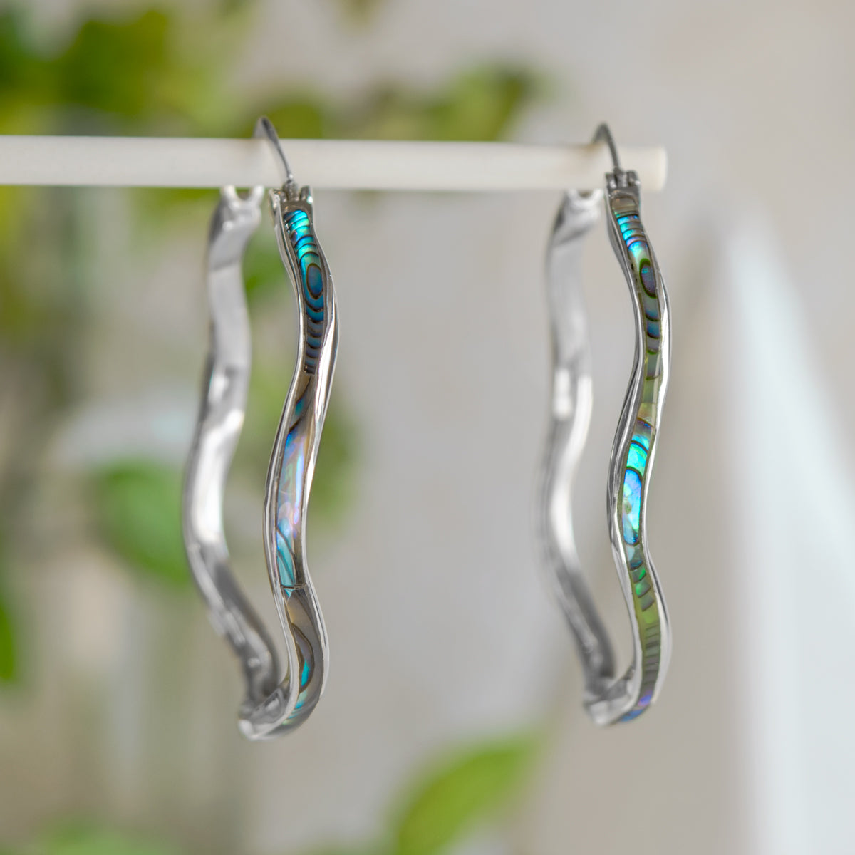 Sterling silver wavy hoop earrings in Abalone (PAWA Shell) or Dyed Red Coral.