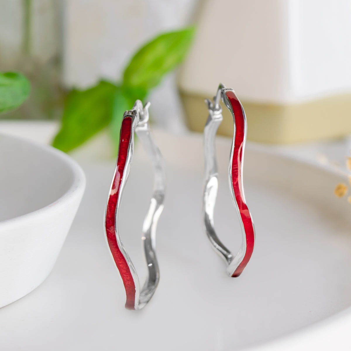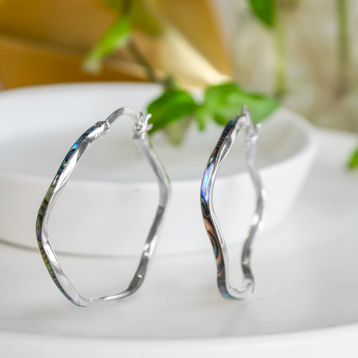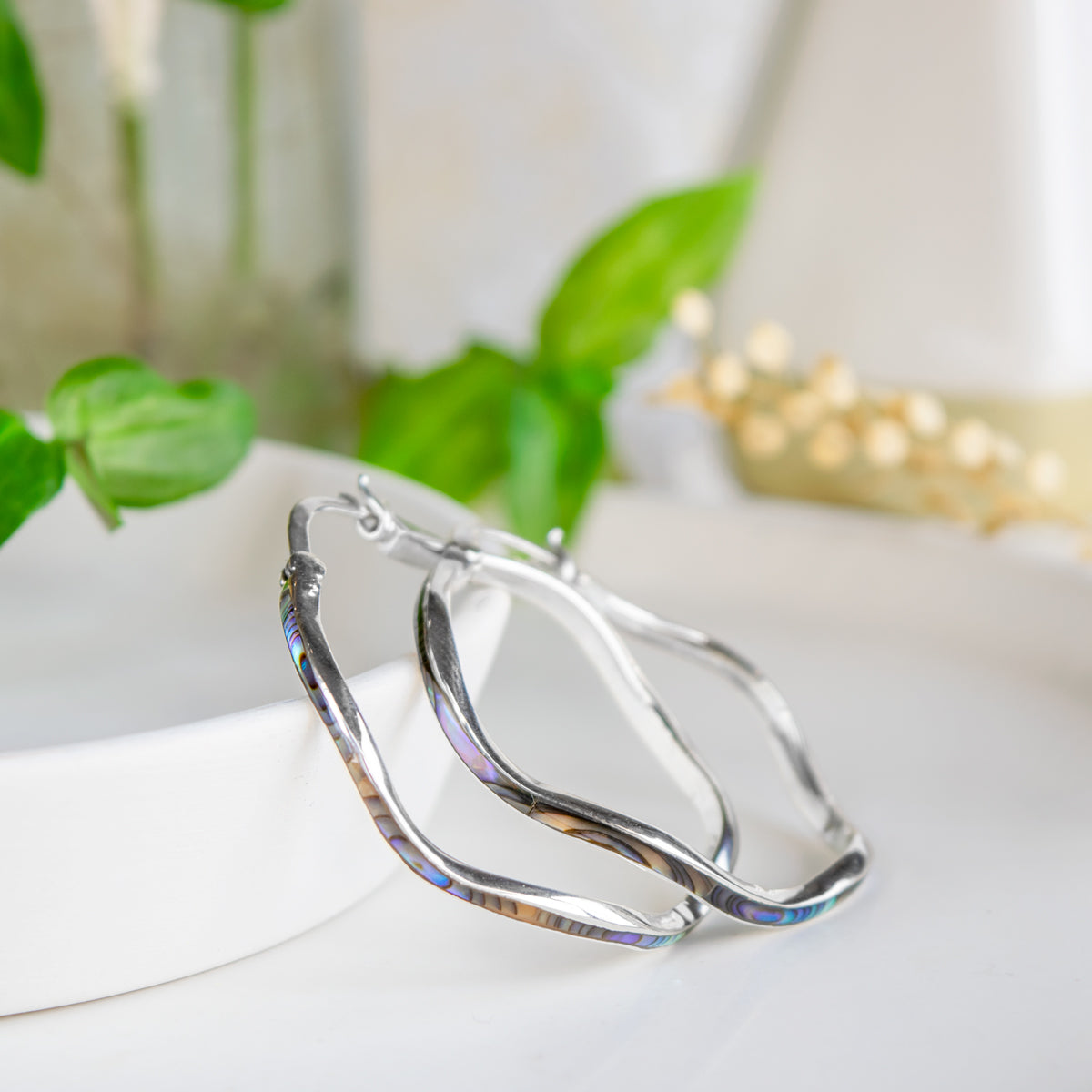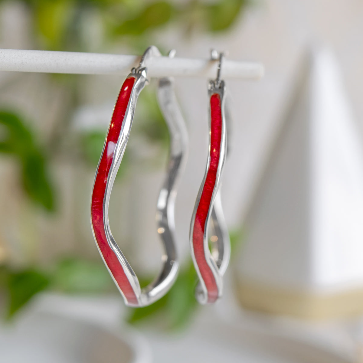 Sterling silver wavy hoop earrings in Abalone (PAWA Shell) or Dyed Red Coral.
