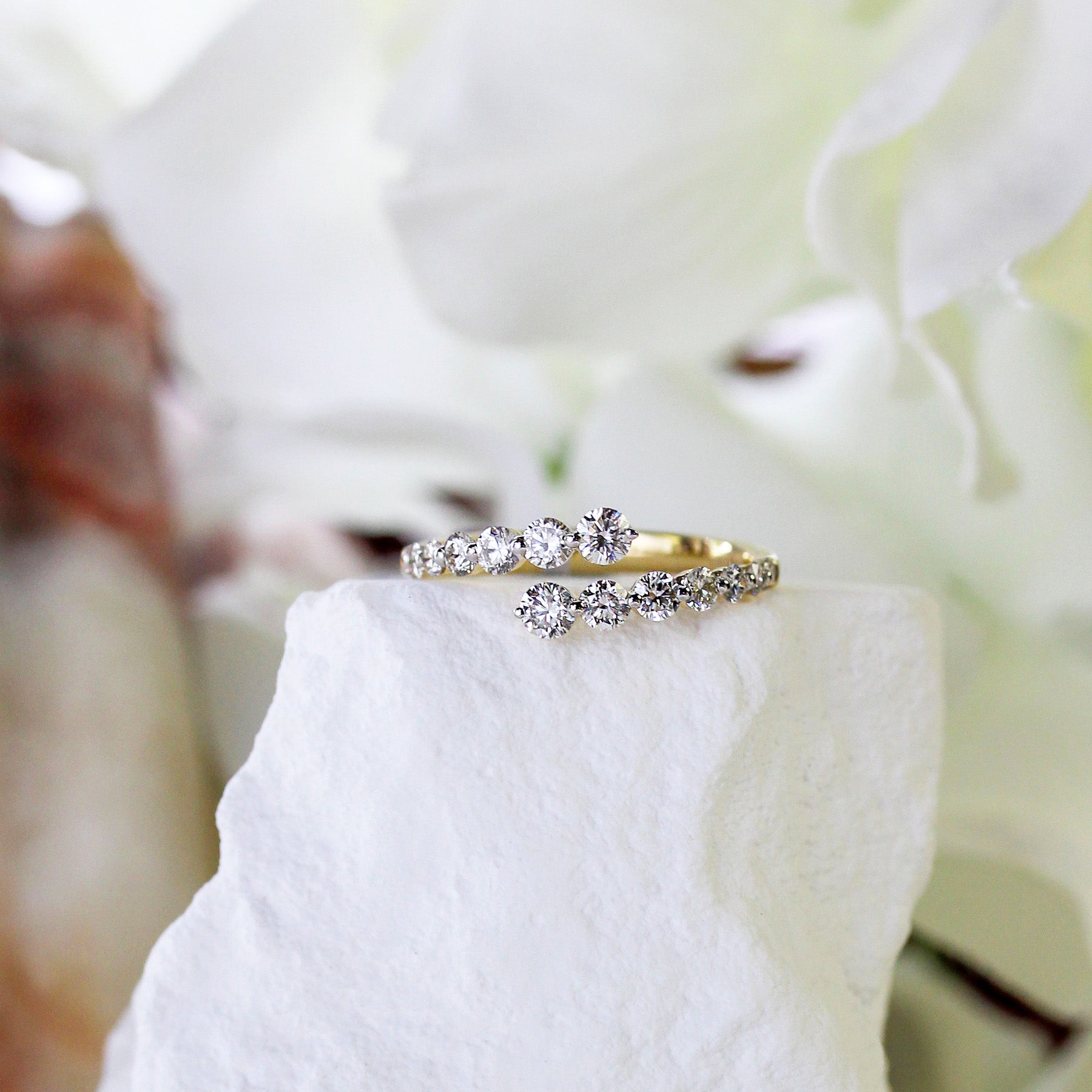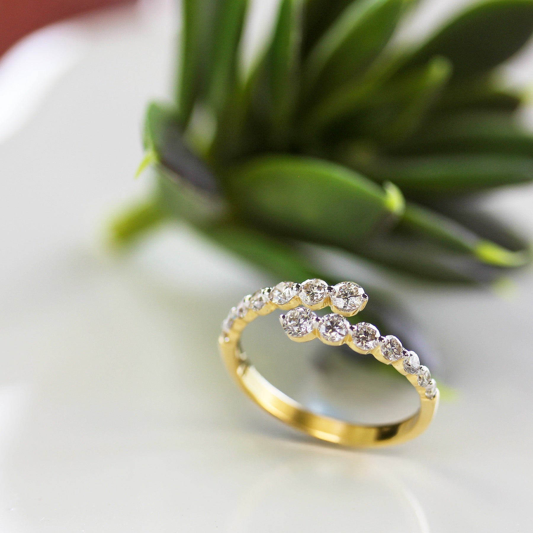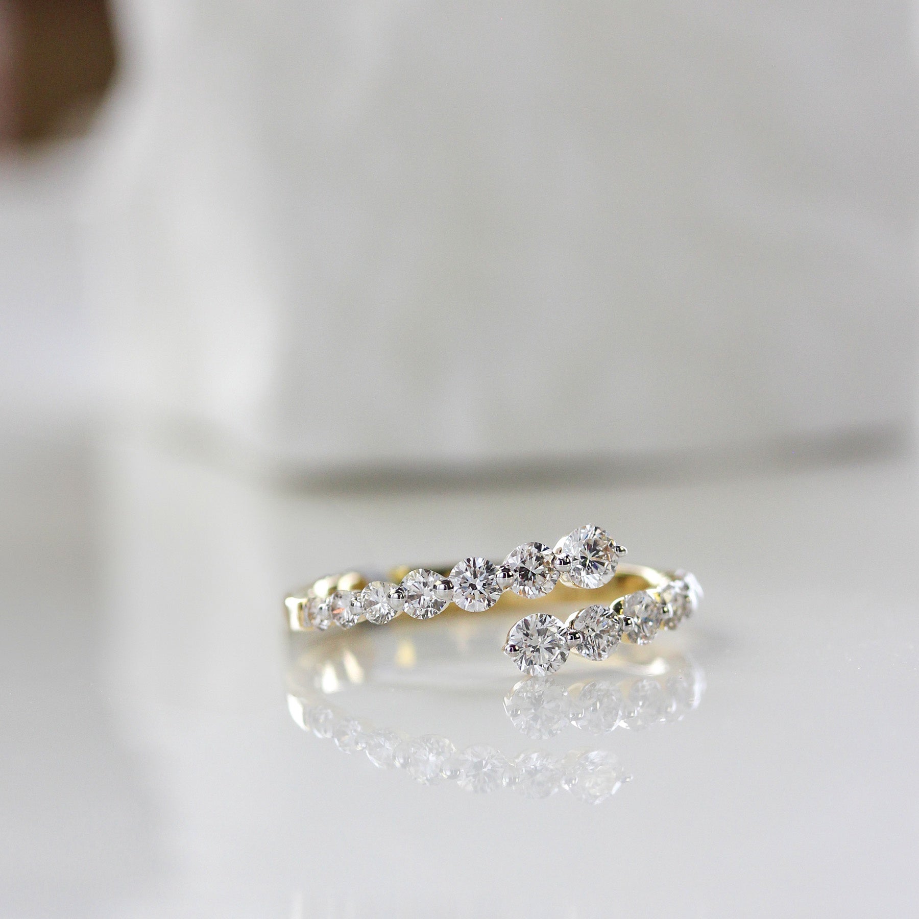 Modern sparkle with effortless elegance. This 14K yellow gold wrap ring features two graceful rows of round brilliant diamonds that curve gently across the finger, totaling 0.921 carats. The open design creates beautiful movement and dimension, allowing each diamond to catch the light from every angle.