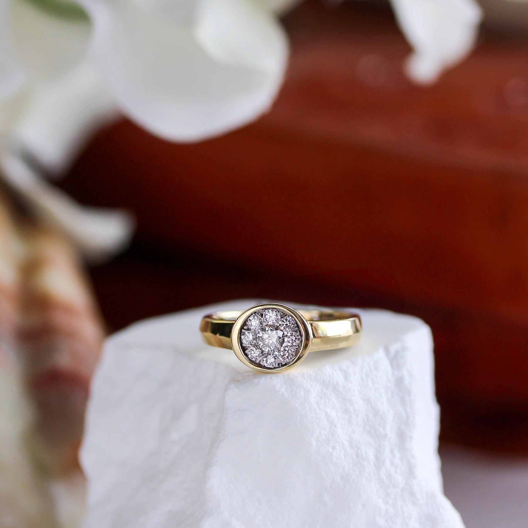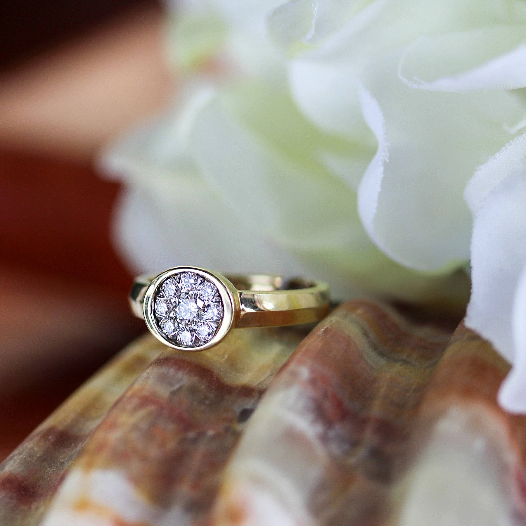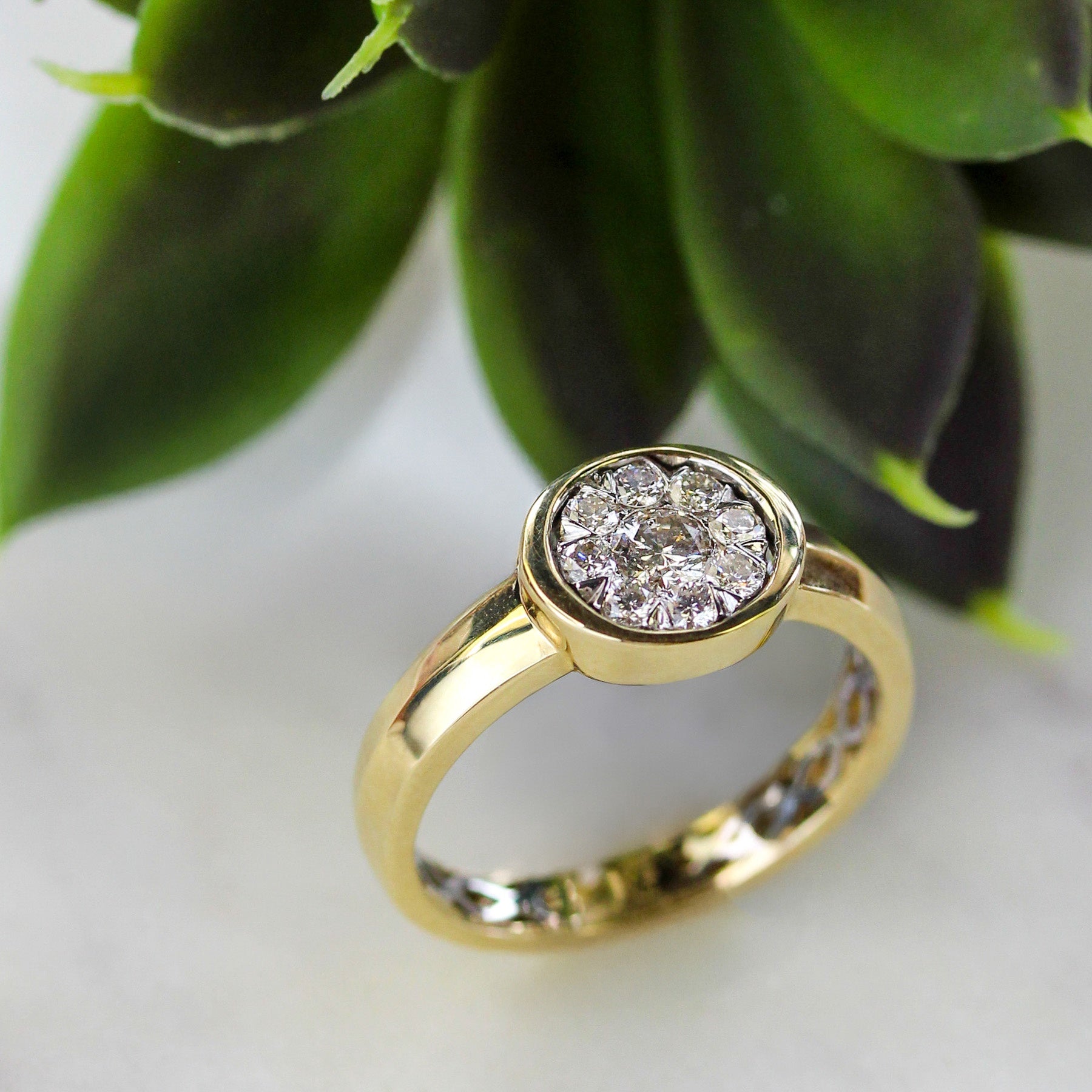 Bold, refined, and beautifully detailed. This two-tone ring features a round diamond cluster totaling 0.421 carats, set in a sleek bezel-style head for a modern, luminous look. The brilliance of the diamonds is enhanced by the rich contrast of 14K yellow gold and platinum (P950), creating a timeless yet contemporary feel.