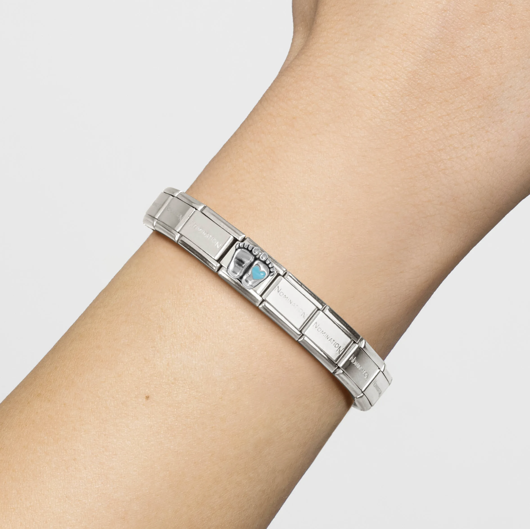 Original Nomination Composable Classic Link for Composable bracelet in stainless steel with Baby Feet with Light Blue Heart symbol with colored enamel. This Link is the perfect way to celebrate the arrival of a little one. This is an adorable addition to any bracelet and captures the Baby-on-the-way mood. Choose this Link that combines the precious sterling silver symbol with light blue enamel details for a Link that is both vintage and adorable. This Link is a great way to remember the birth or baptism of your little one.