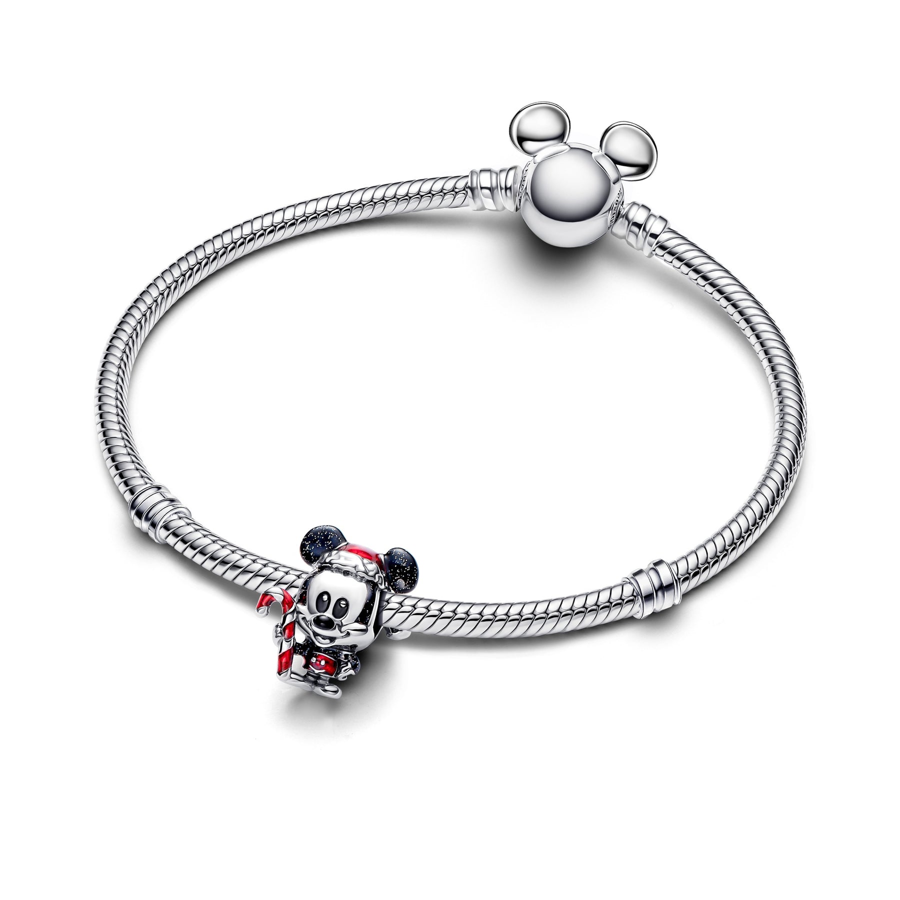 Get into the holiday spirit with Disney's Mickey Mouse. Wearing a Santa hat and holding a candy cane, this sterling silver charm features vibrant enamel and intricate detailing — a festive icon of joy.