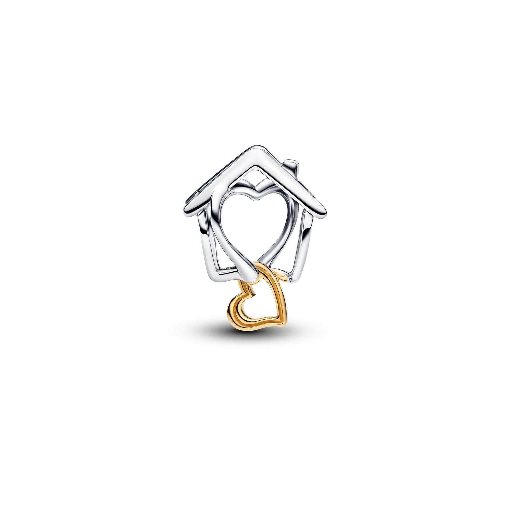 Find warmth in every detail. This sterling silver and 14k gold-plated charm features an openwork house with a dangling heart and the engraving 'With you, I'm home'. A symbol of love and belonging.