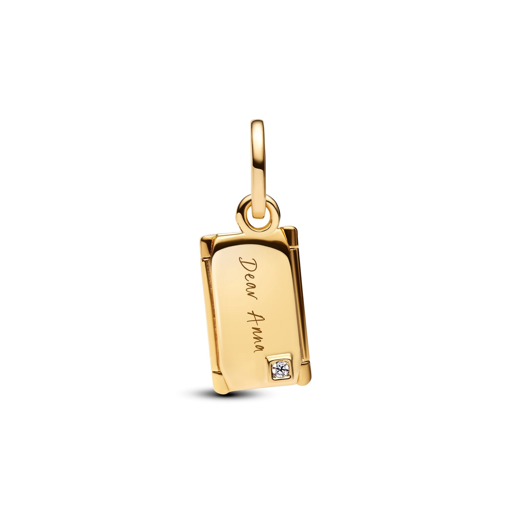 Send a little love. This 14k gold-plated openable envelope dangle sparkles with clear cubic zirconia and offers engravable space inside and on the front – perfect for heartfelt messages.