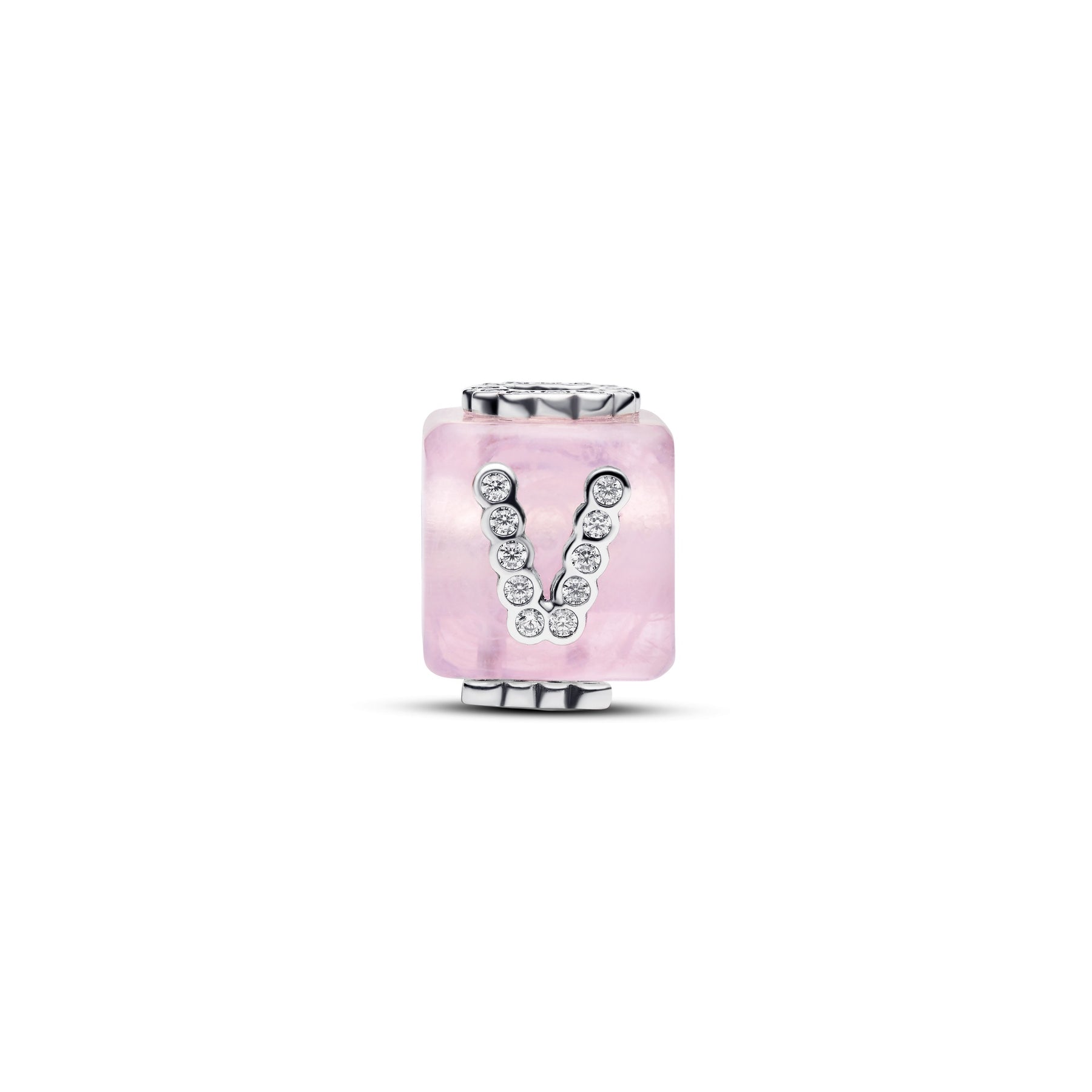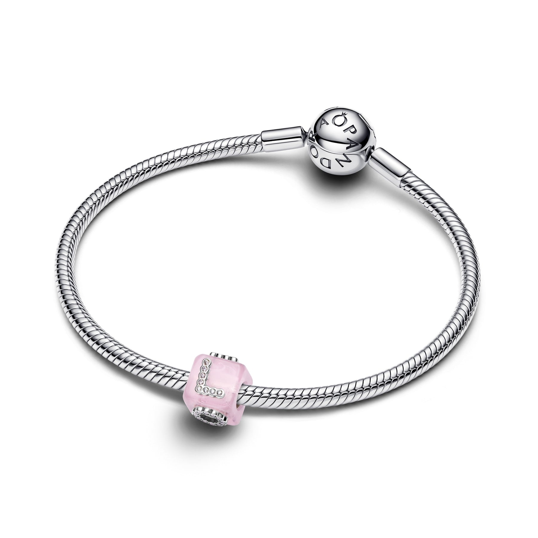 Say it from every side. This sterling silver charm features a pink Murano glass cube with the word “LOVE,” each letter set with clear cubic zirconia – simple, strong, and full of heart.