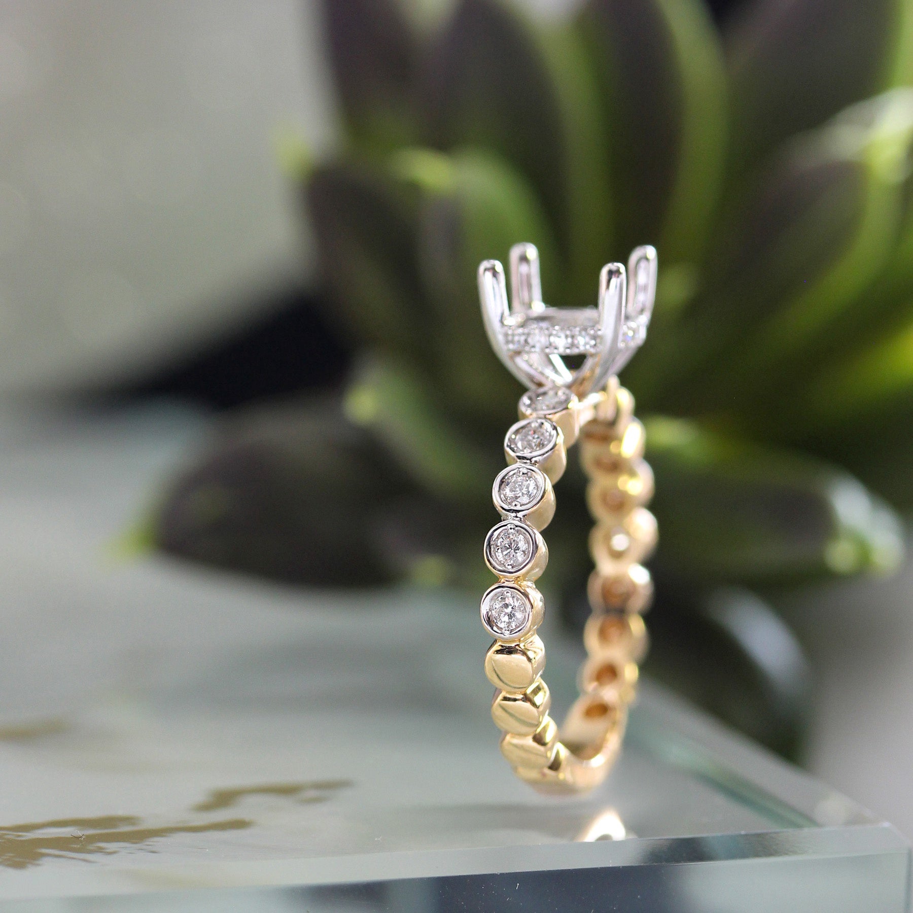 A beautifully detailed two-tone setting designed to elevate your center stone. This 14K yellow gold ring features 0.18 carats total weight of bezel-set round diamonds along the band, adding refined sparkle and modern texture.