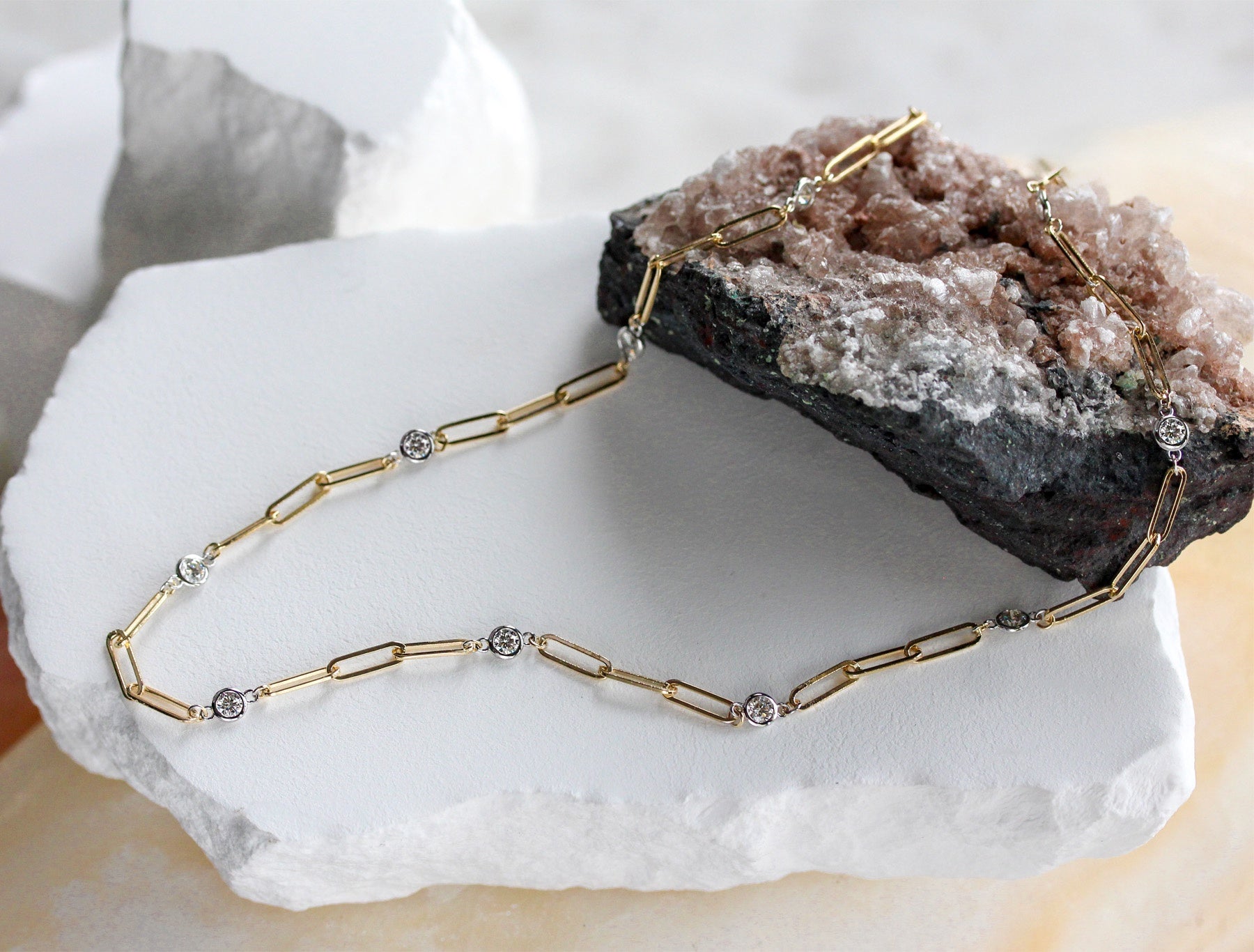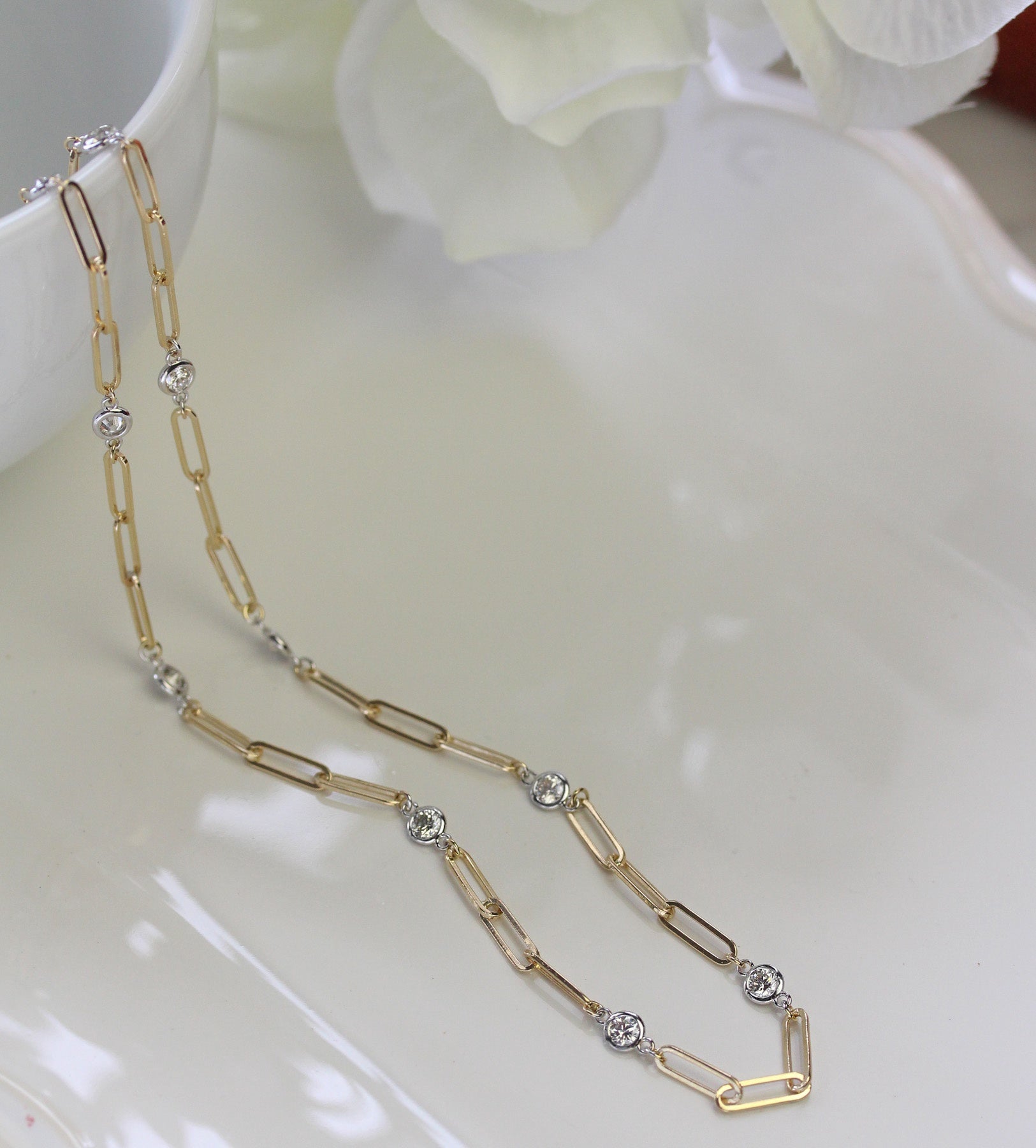Bold yet refined, this 14K two-tone necklace features modern paperclip-style links accented with bezel-set diamonds totaling 1.60 carats. The mix of yellow and white gold adds dimension and versatility, making it effortless to style with any metal.